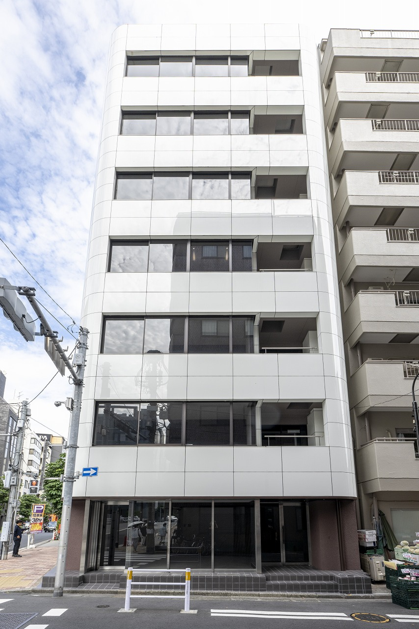 純白の光沢感と濃色かつマットな質感によるコントラストが印象的な外観。オフィスの顔でもあるアプロー チ部分は、印象的なガラスの意匠照明をアクセントにホテルライクな雰囲気を演出し、来館者を迎えます。