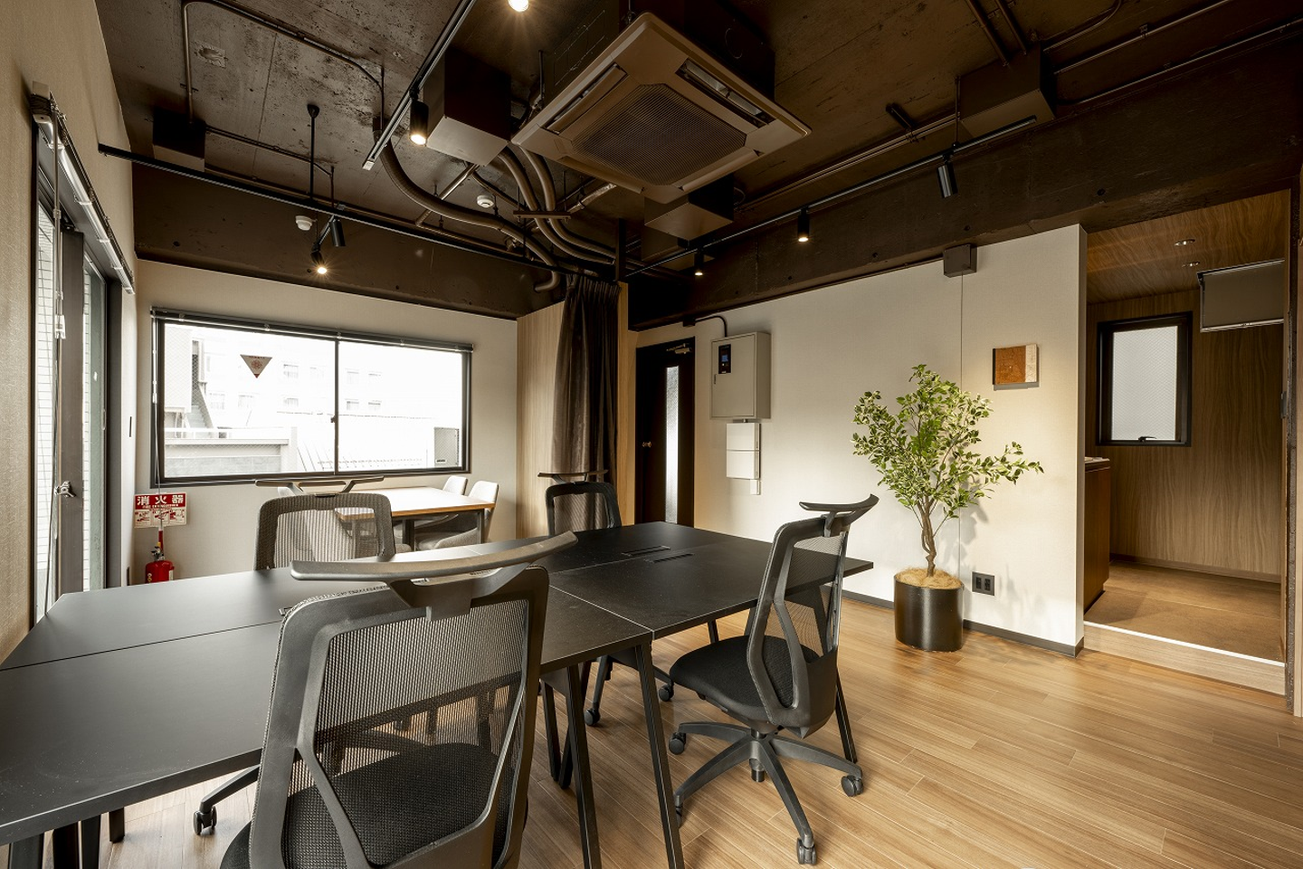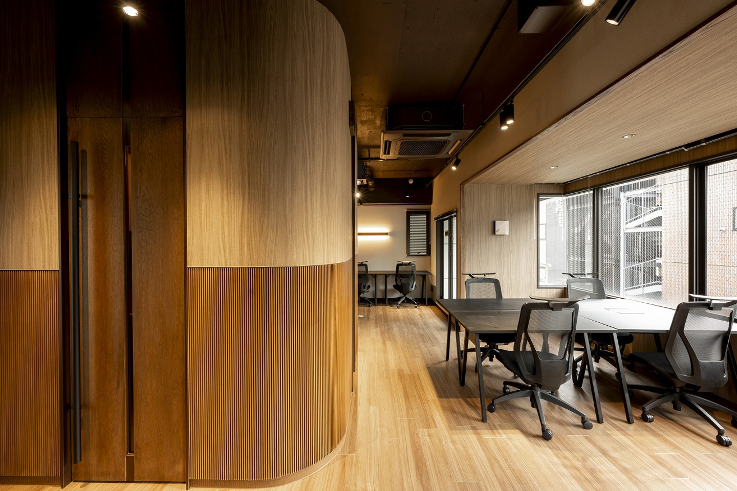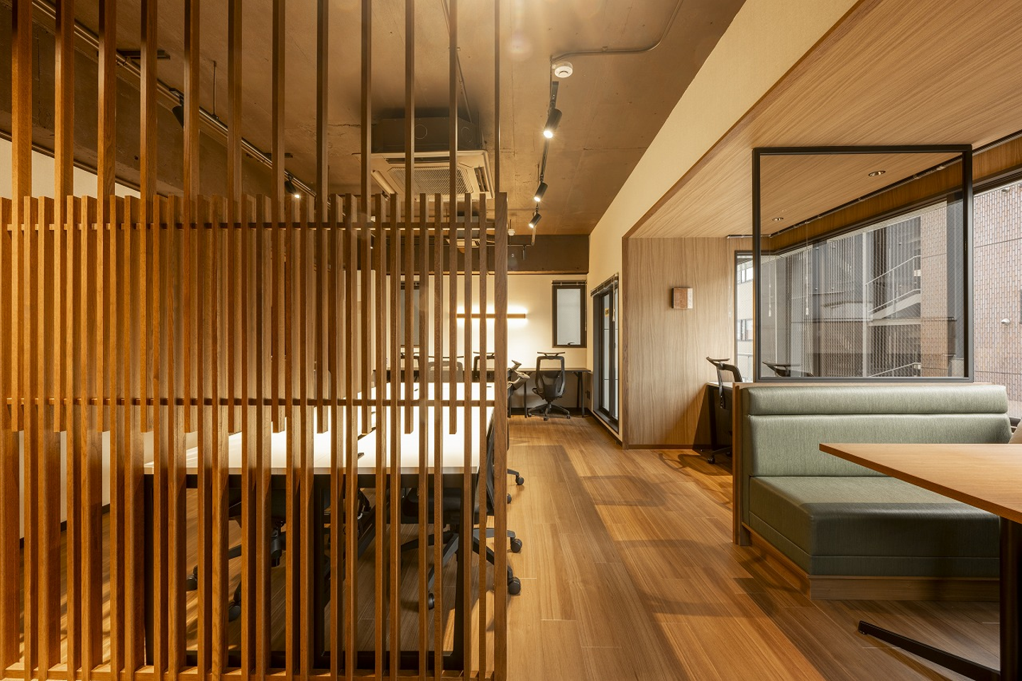 個室ミーティングルームを完備したセットアップオフィス。カウンター席、個室ブースも完備しています。 タイプA同様、全体的に落着きのある木目で構成されたスタイリッシュでシンプルな空間に、縦格子や緑青 色をアクセントにしたオフィス空間です。
