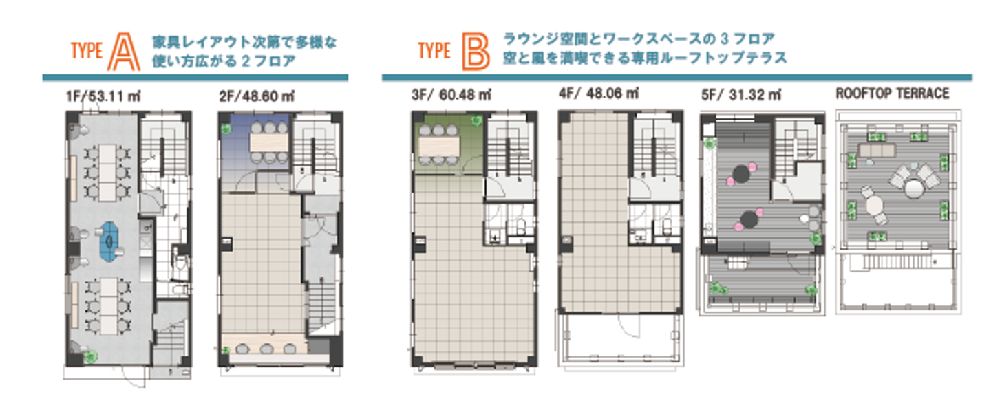 また、貸し方にも柔軟性をもたせ、1棟貸しと2区画貸しの両方に対応可能とし、将来的な運用リスク軽減へも配慮しています。2つのエントランスを有する建物の特徴を生かし、通りに開かれたマルチスペースを有する貸室Aと、専用ルーフトップテラス付の貸室Bの特徴ある2つの区画を設けています。