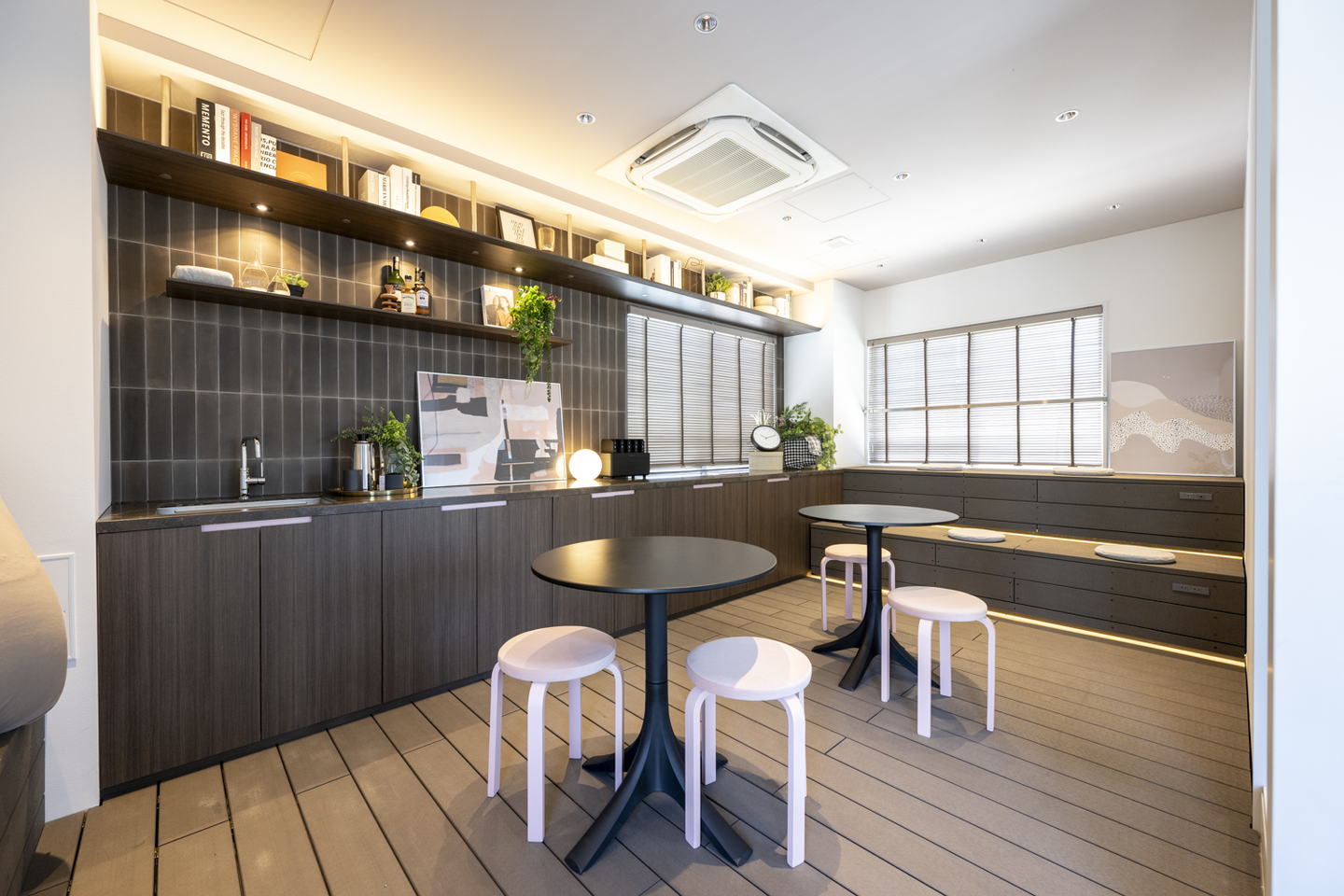 【5階ラウンジ】コミュニケーションが生まれる・チームイノベーションを加速させる「場」、 広めのキッチンカウンターを設置し、社員間の交流の場やちょっとしたセミナーなどでも利用する ことができるようになっている。