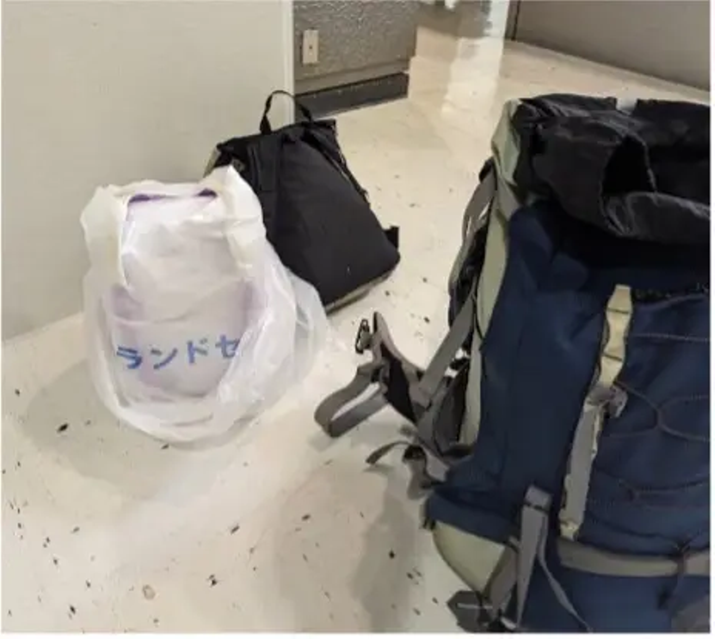出発前の成田空港。旅のお供は、9月から小学校に入学するインターン生の妹へのプレゼント(ランドセル)
