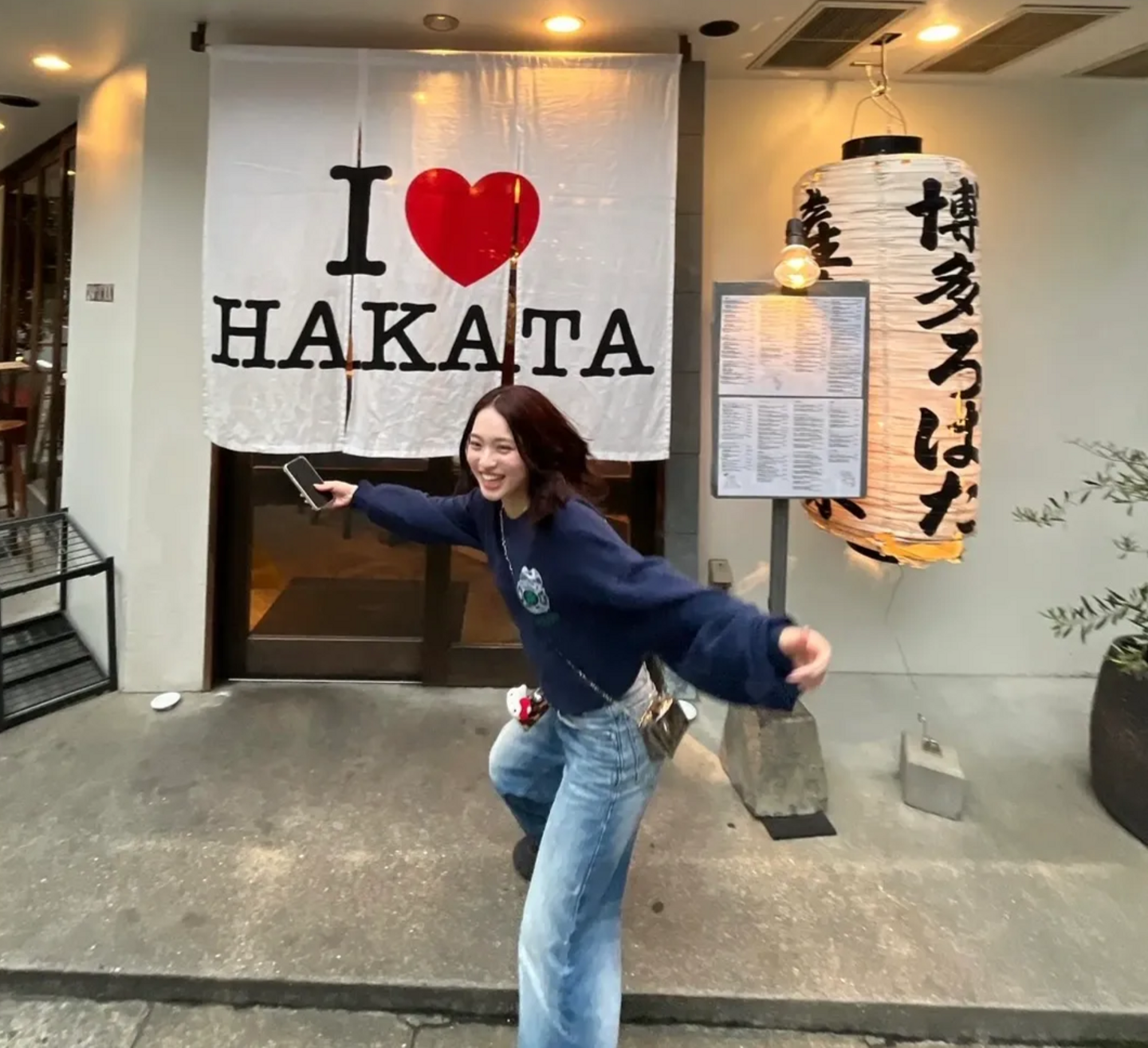🔼 博多にある激うま居酒屋を前に、テンションが上がりすぎてブレブレになっています。笑