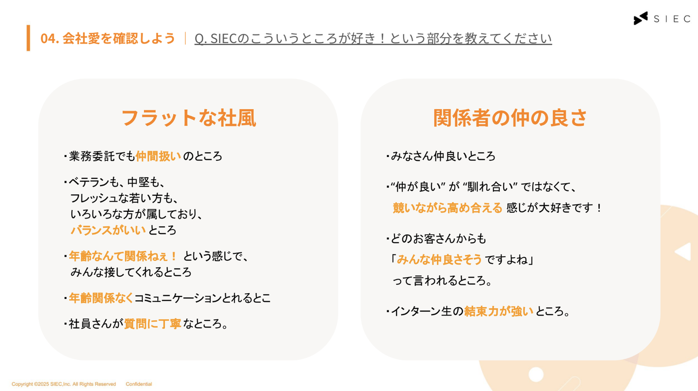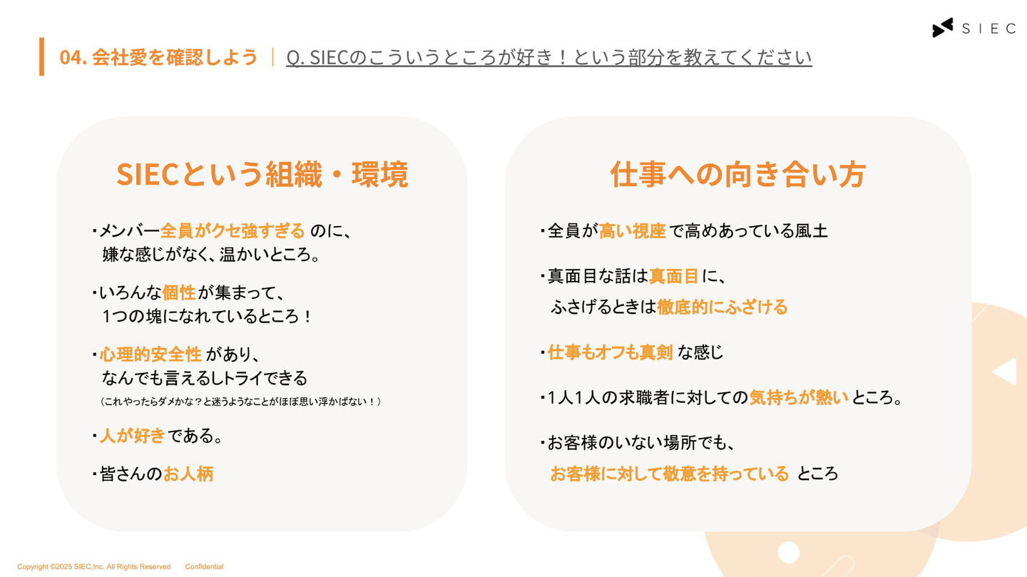 Q. SIECのこういうところが好き!と言う部分を教えてください