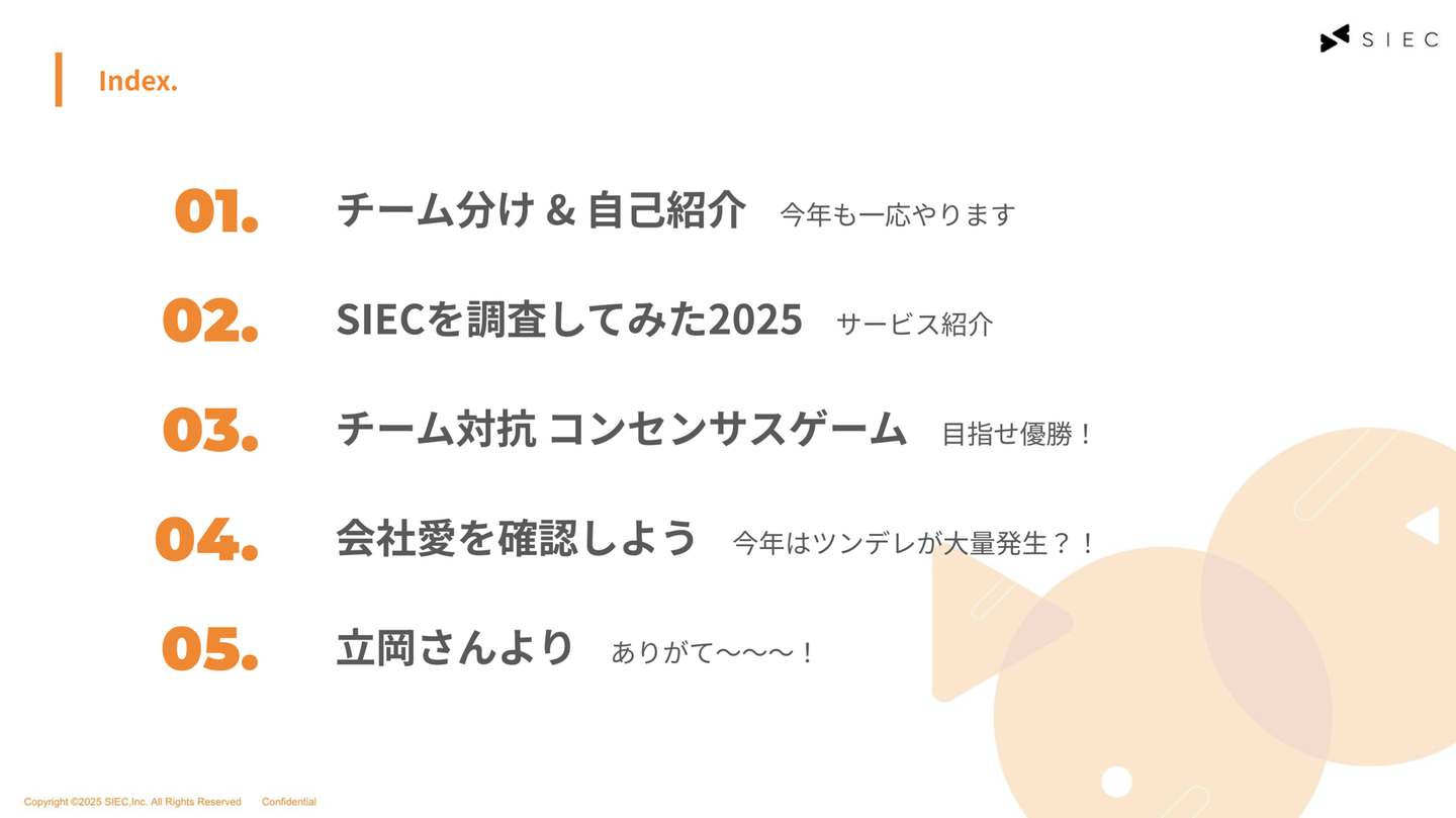 まず先ほどアジェンダを公開した企画編についてですが、前半戦は、SIEC関係者の皆様に向けた事前アンケートに回答結果を、さまざまな角度から考察してみたプレゼンでした。