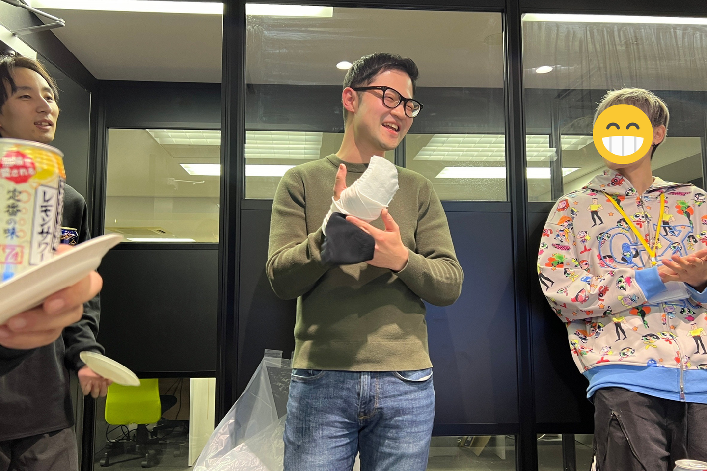 左手を骨折したときのエピソードを交えて自己紹介する若井田代表