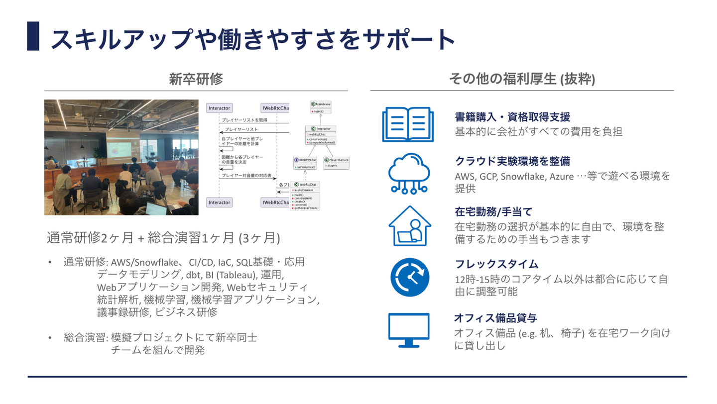 新卒研修講師も担当しているTさんから、入社後はどんな研修が待っているのか紹介してもらいました。ちゅらデータでは他社に負けず劣らずの内容の新卒研修を用意していると自負してますが、うまく伝わったでしょうか…