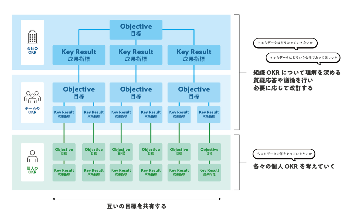 通常OKRは、上位にある「KR(成果指標)」に紐づく「O(目標)」を設定し、個人レベルの OKR までブレイクダウンしていくやり方で策定すると思います。しかしちゅらデータにおいて は、個人OKRまで落とし込まれた目標を踏まえて、再び会社全体のOKRを調整していくという「トップダウンで作るOKR」と「ボトムアップで作るOKR」の双方向から策定していく方法を採用しています。