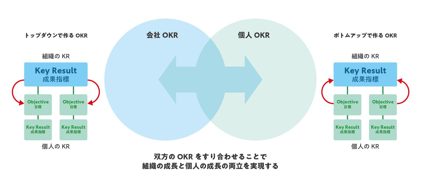 そのため、先に策定された会社OKR(組織の目指したいこと)全ての項目に対して必ず個人OKRを紐づけないといけないというわけではありません。まずは、各々が成長するために掲げたい目標を共有してもらい、必要に応じて会社OKRを調整することで、結果として 「個人のやりたいこと (⇒ 頑張り) が、会社のためになる」という紐付けができると良いという考えのもと、このような設計にしています。