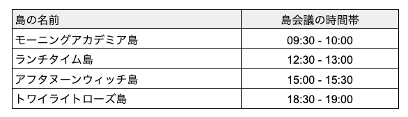 島のメンバーは「島会議」と呼ばれる集まりに参加してメンバーとコミュニケーションを取ります。会議と名はついていても何かを協議するような堅苦しい集まりではなく、基本的には自身が担当されている仕事の状況を共有したり、困っていることを相談したり、話題になっているトピックスについて意見を言い合ったりする集会のようなものです。