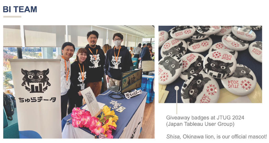 ちゅらデータはエンジニアとサイエンティストが多く在籍する会社ですが、3年連続でJapan Tableau User Group(JTUG)*のプラチナスポンサーを務めています。BIチームのメンバーはTableauコミュニティの中で、さまざまなアクティビティに取り組んでいますが、人数はそれほど多くはなく少数精鋭という形で活動しています。私はJTUGサポーターズのデータチームに入っていて、JTUG内のデータ分析とデータ準備を支援しています。