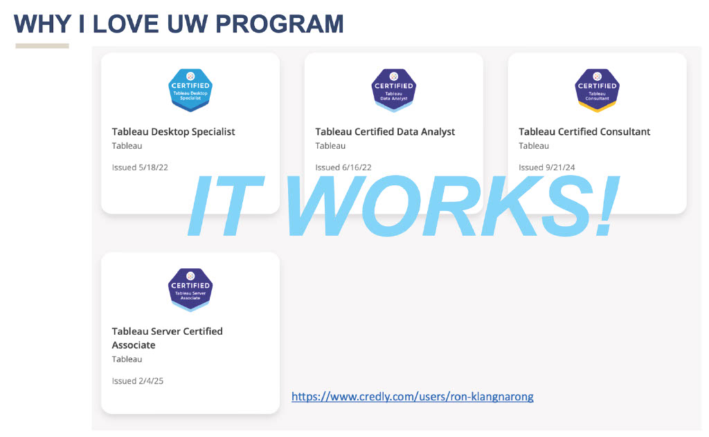 そこで出会ったのは、ワシントン大学の「Data Visualization with Tableau」*です。データとデザインの経験はゼロだったので、修了できるか不安がありましたが、ワシントン大学のカリキュラムは未経験者でもフォローしやすい構成となっており、また試行錯誤を繰り返しながら楽しく学習できる環境づくりにも力を入れていると感じました。ですので私はモチベーションを維持したまま最後まで学習し、キャリアチェンジに役立つTableau資格を多数取得しました。
