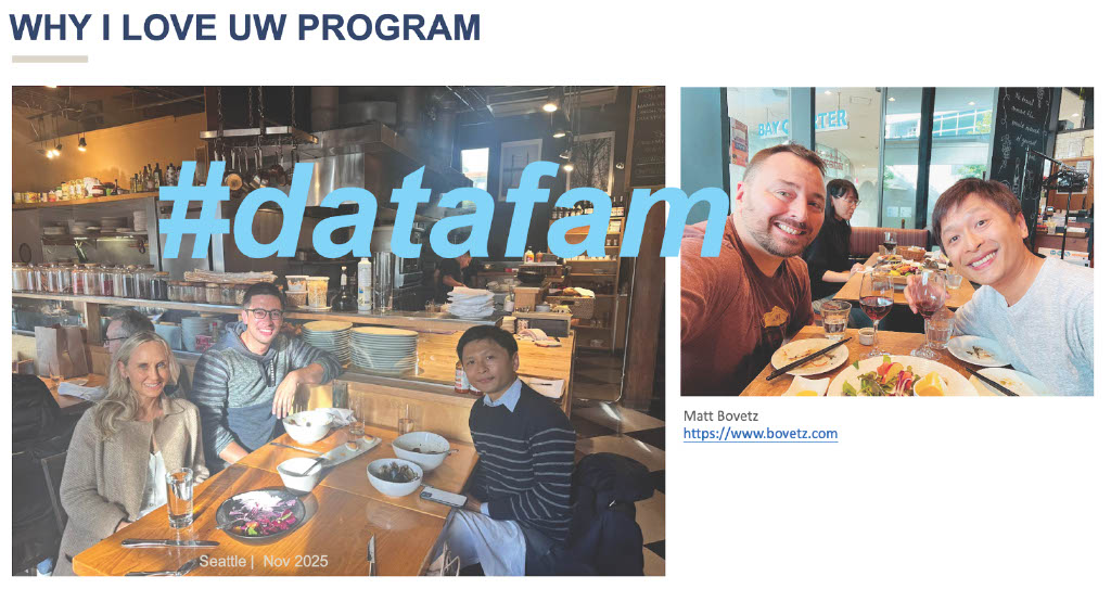こんにちは、BIエンジニアのロンです。4月30日(水)にアメリカのワシントン大学(UW)が開催した社会人向けコースの「Data Visualization with Tableau」に参加してきました。今回はIntroduction into Data Visualizationオンライン講義に、同大学の卒業生でもある私をゲストスピーカーとしてお招きいただき、ちゅらデータとBIチームを紹介しつつ、同講座がどのように私のキャリアチェンジを後押ししたかを話しました。受講者の皆様の学習や今後のキャリアを考える良い機会となっていれば幸いです。