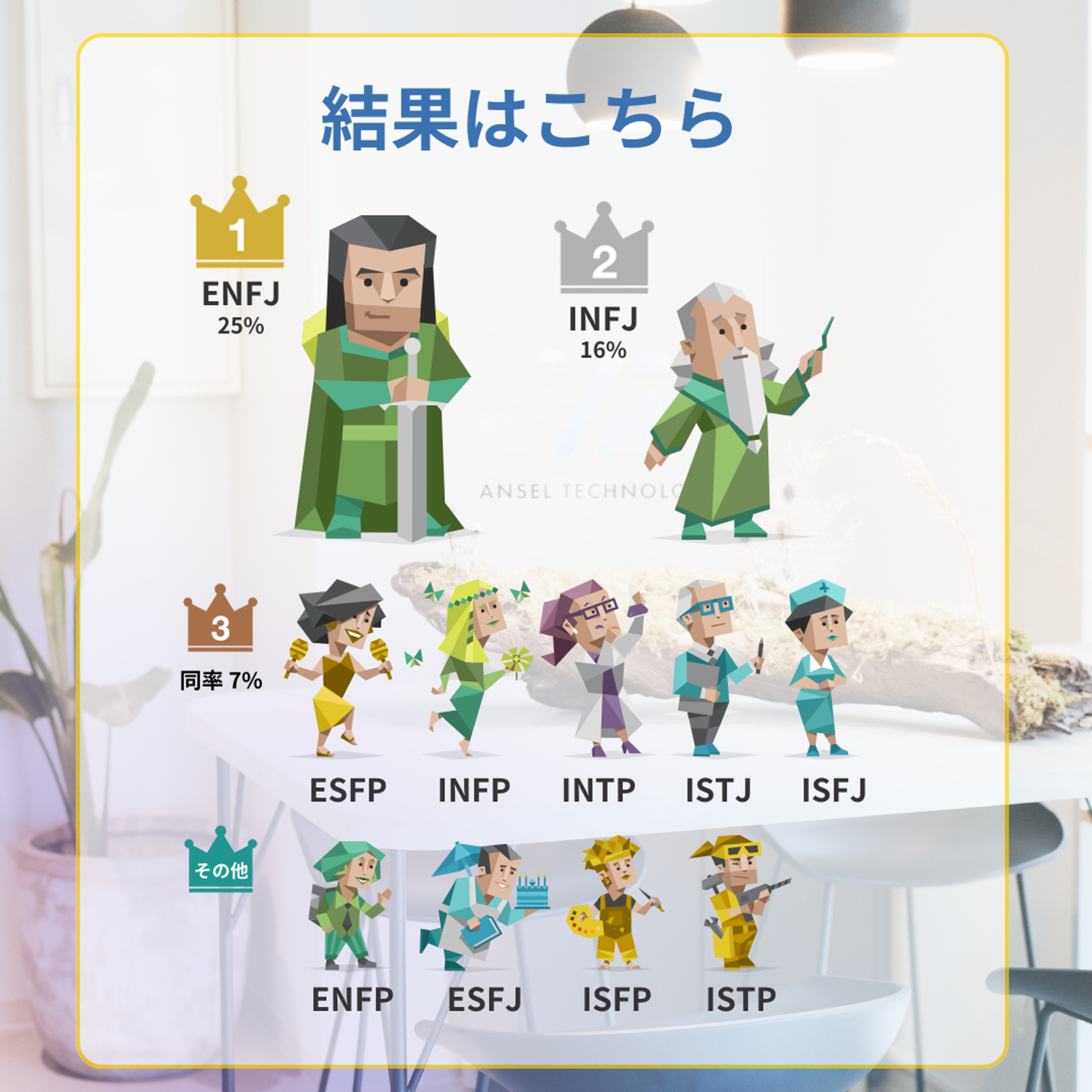 アンセルの中で最も多いタイプを一言で言うと、「リーダーシップと洞察力に優れた主人公タイプ」でした🥳