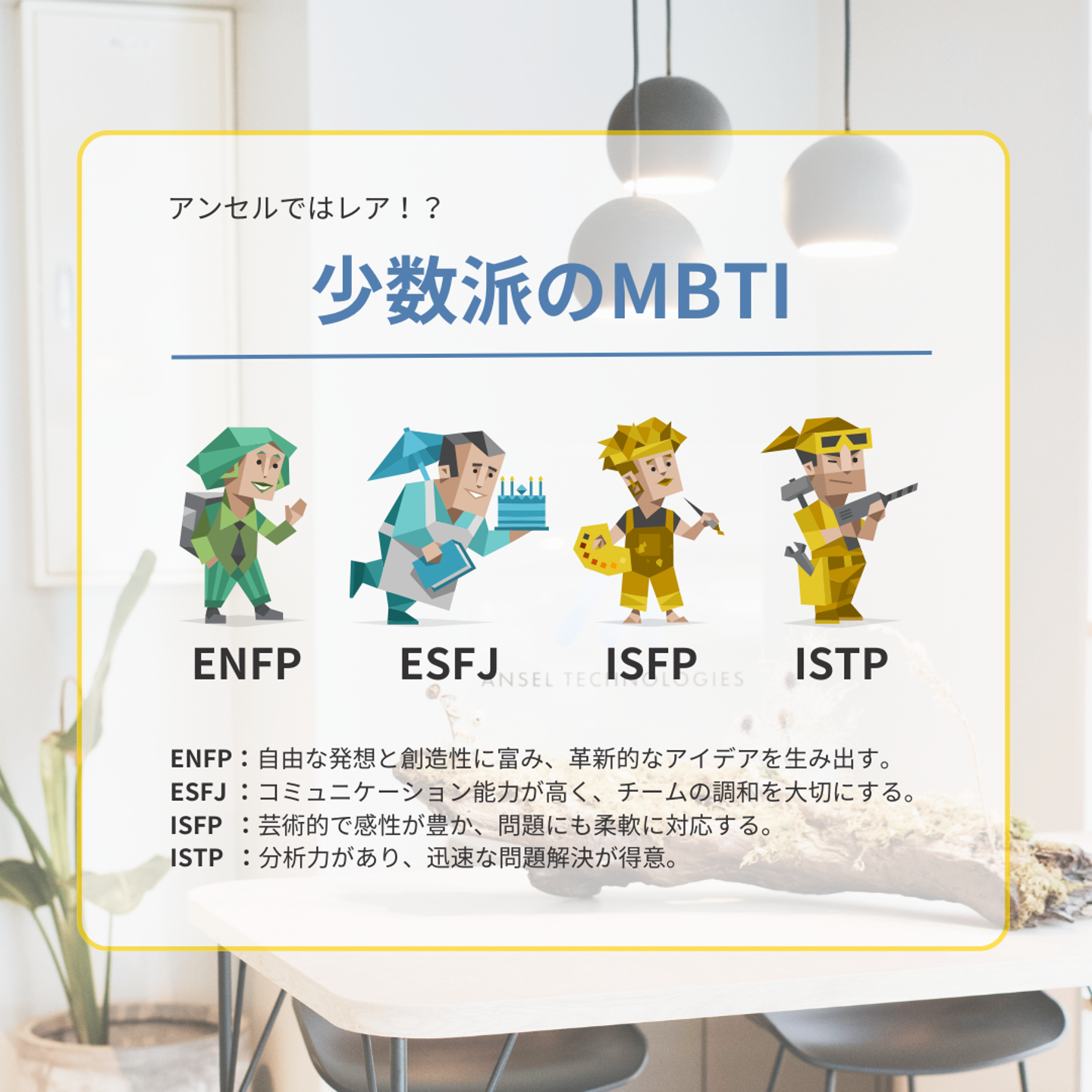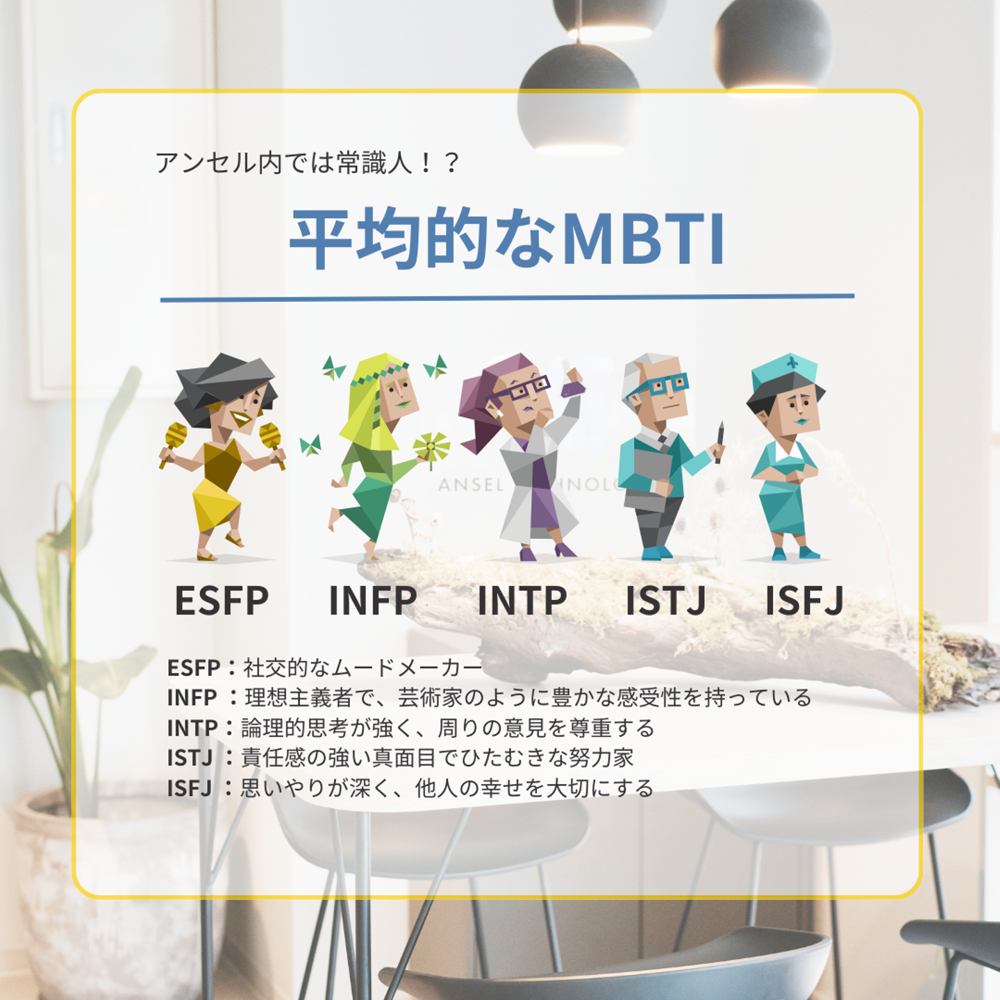 ちなみにエンジニア向きと言われているのはINTP( 論理学者 )ですが、実際アンセルの社員たちはどのタイプなんでしょうか!