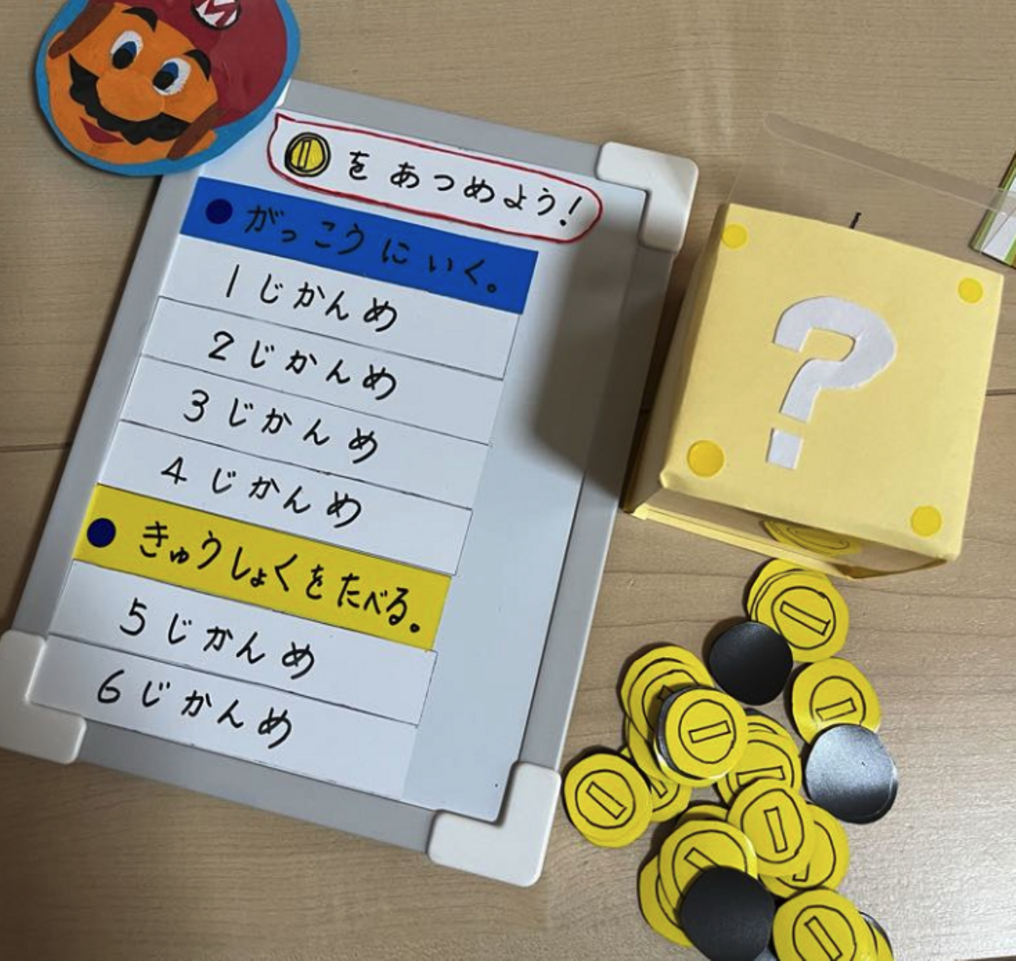 マリオゲームにはまったお子さまには、ウォークラリーボードを使用。登校できた日だけが可視化でき、より自信へ繋がります✨所々に「ごほうび」ボックスがあり、特別シールが出てきたり小ネタを挟みつつ、楽しみの中での自立支援を行いました😊学校へ行けるようになってからは、学校の流れに慣れていくボードをマリオゲーム風にアレンジ。クリアしたらコインをゲットできる仕組みで、学校生活への楽しみ作りとコミュニケーションのきっかけ作りにも活用しています💖