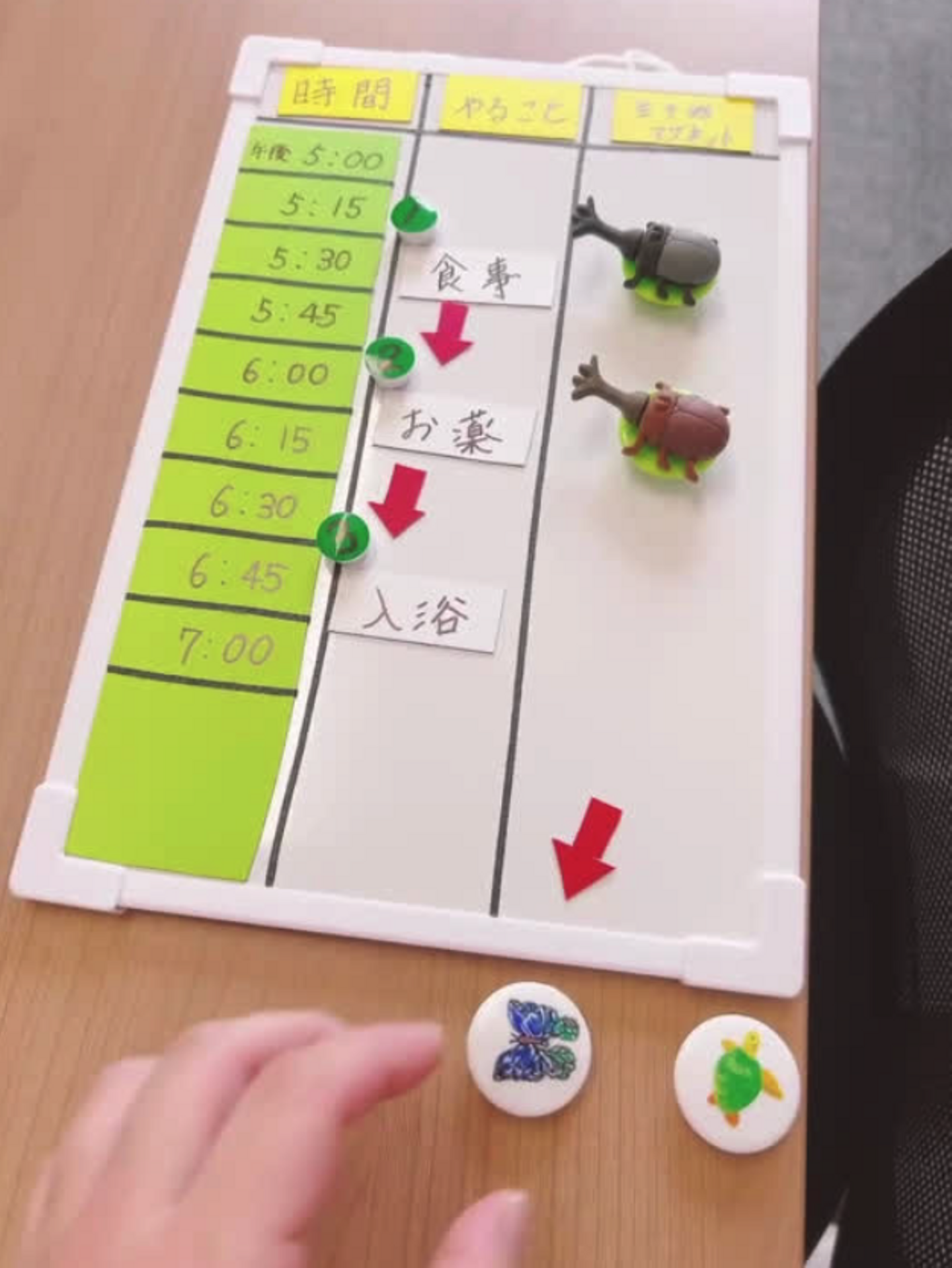 生命への関心度が高い特性を活かし、手作り虫かごでタイムスケジュール管理を可視化しました🐛好む生き物をいくつか用意し、下校後のおうちスケジュールを一緒に組み立て、できたところへ生き物マグネットを貼っていくことで、楽しみながら自立支援へ繋げています🌟