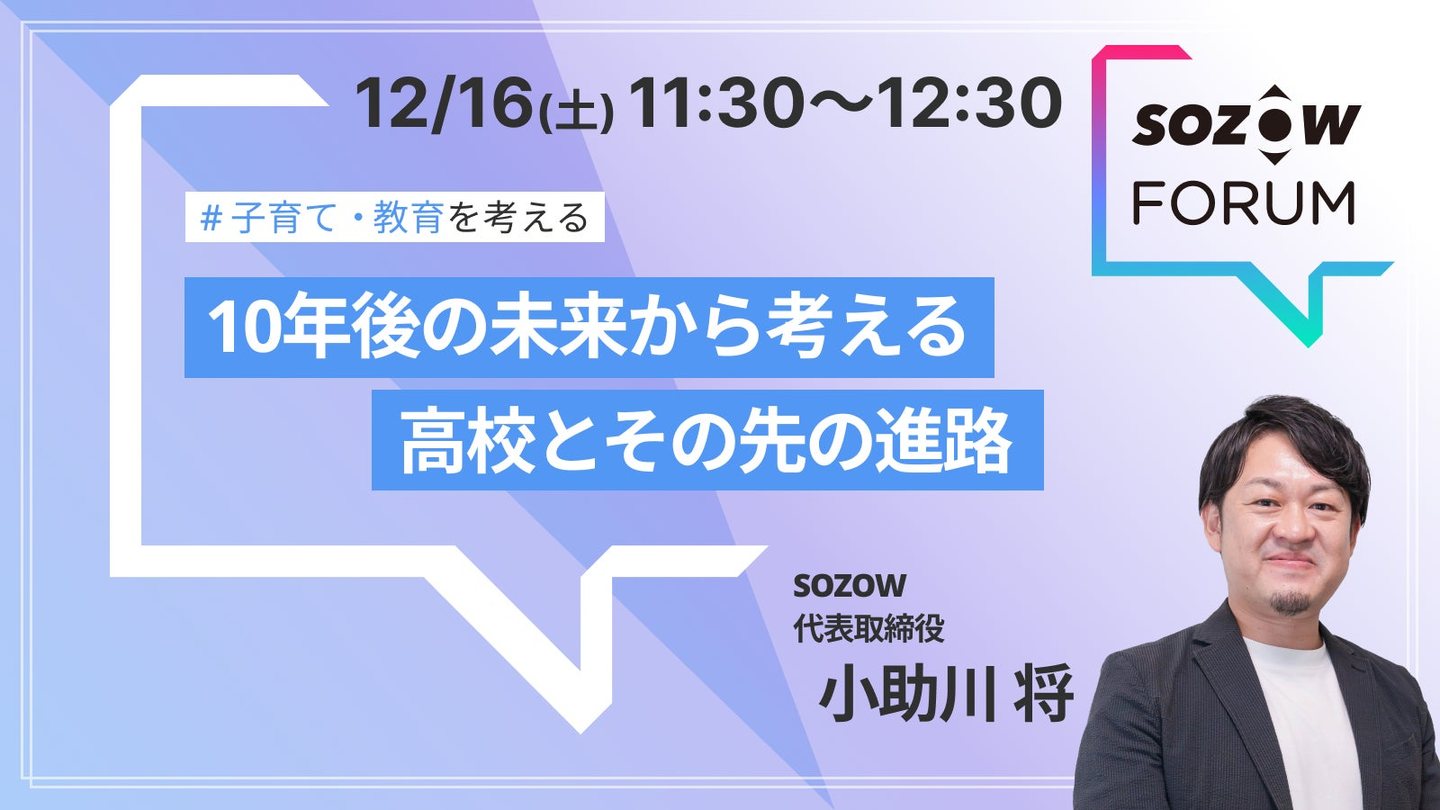 また、2つ目のセッション「10年後の未来から考える高校とその先の進路」では、SOZOW代表の小助川 将が、起業家の視点から今の子どもが大人になる5〜10年後の未来の社会を考え、さらに歴史からの学びも踏まえて、社会変化がもたらす子育て・教育のあり方や子どもの学びについて問い直します。また、通信制サポート高校設立準備中の立場から、中学卒業後の様々な進路の選択肢もご紹介予定です。