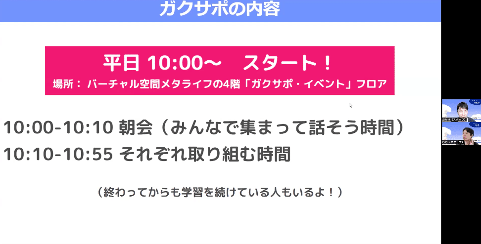 平日午前中にメタライフに集合し、それぞれ取り組むべき教材を自学自習で進めていくサポートをするのが、『ガクサポ(学習サポート)』の時間です。
