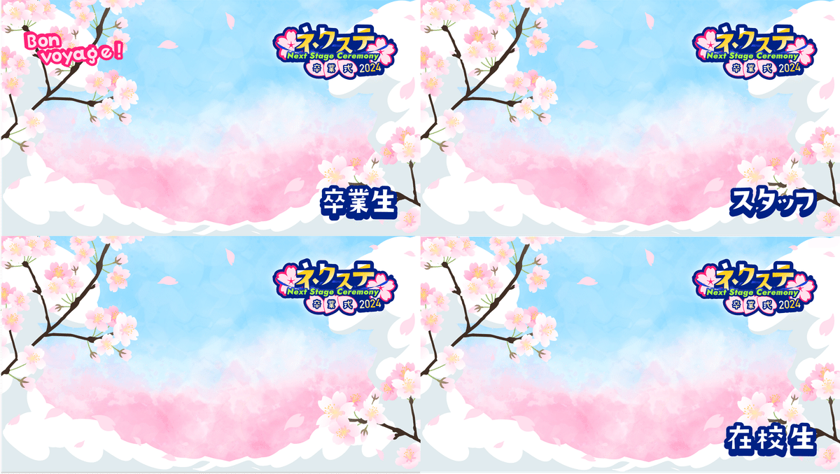 zoomで参加する在校生もスタッフもみんな、お揃いのzoom背景で統一!