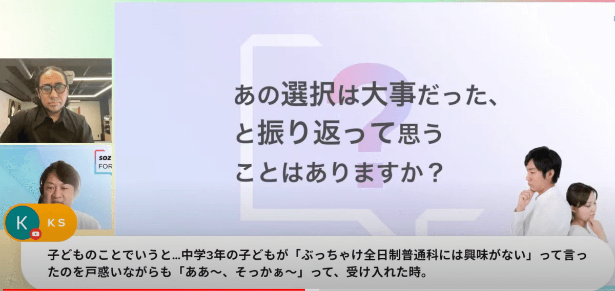 「お父様の『諦めてなかった』という言葉に涙が出ました。私も同じ思いで、不登校の息子と過ごしています。さいごにお話のあった『長期的に考えること』を大切にしていきます。」