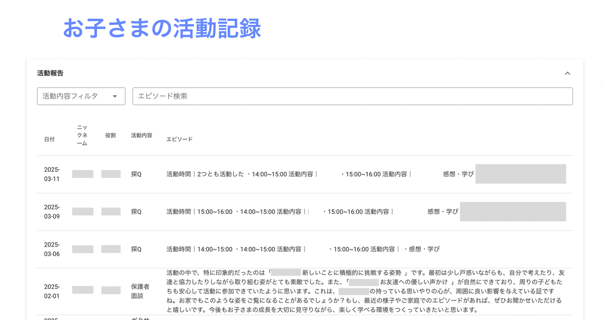 入学したての頃は馴染めているかどうか不安もあったため、活動記録*をこまめに見るようにしていました。当時担当してくださっていたスタッフさんが、活動記録を本当に丁寧に書いてくださっていて、活動の様子がとてもよく伝わり、安心したのを覚えています。
