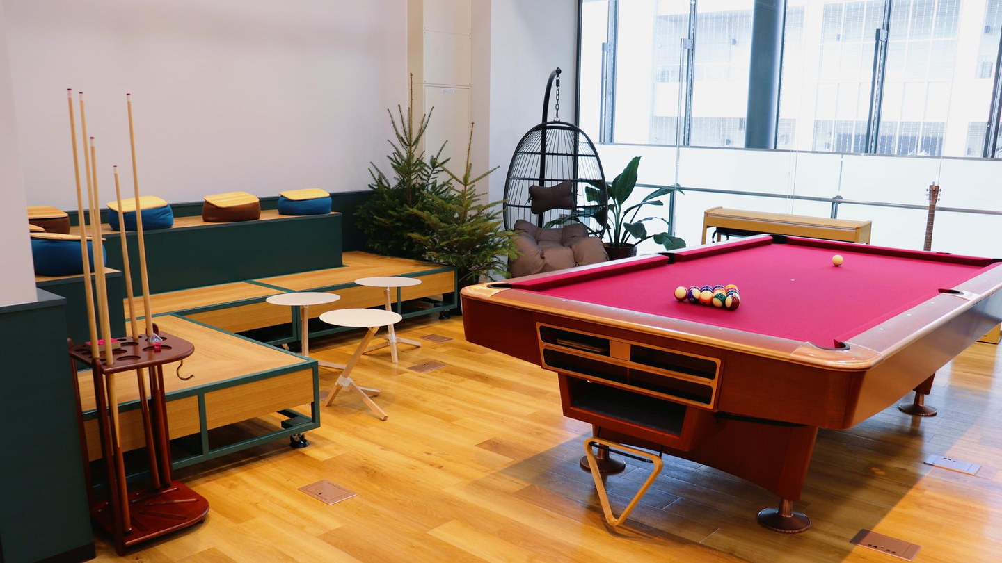 ▲日中のビリヤードコーナー。グリーンを基調としたオフィスに映える、ワインレッドのラシャ