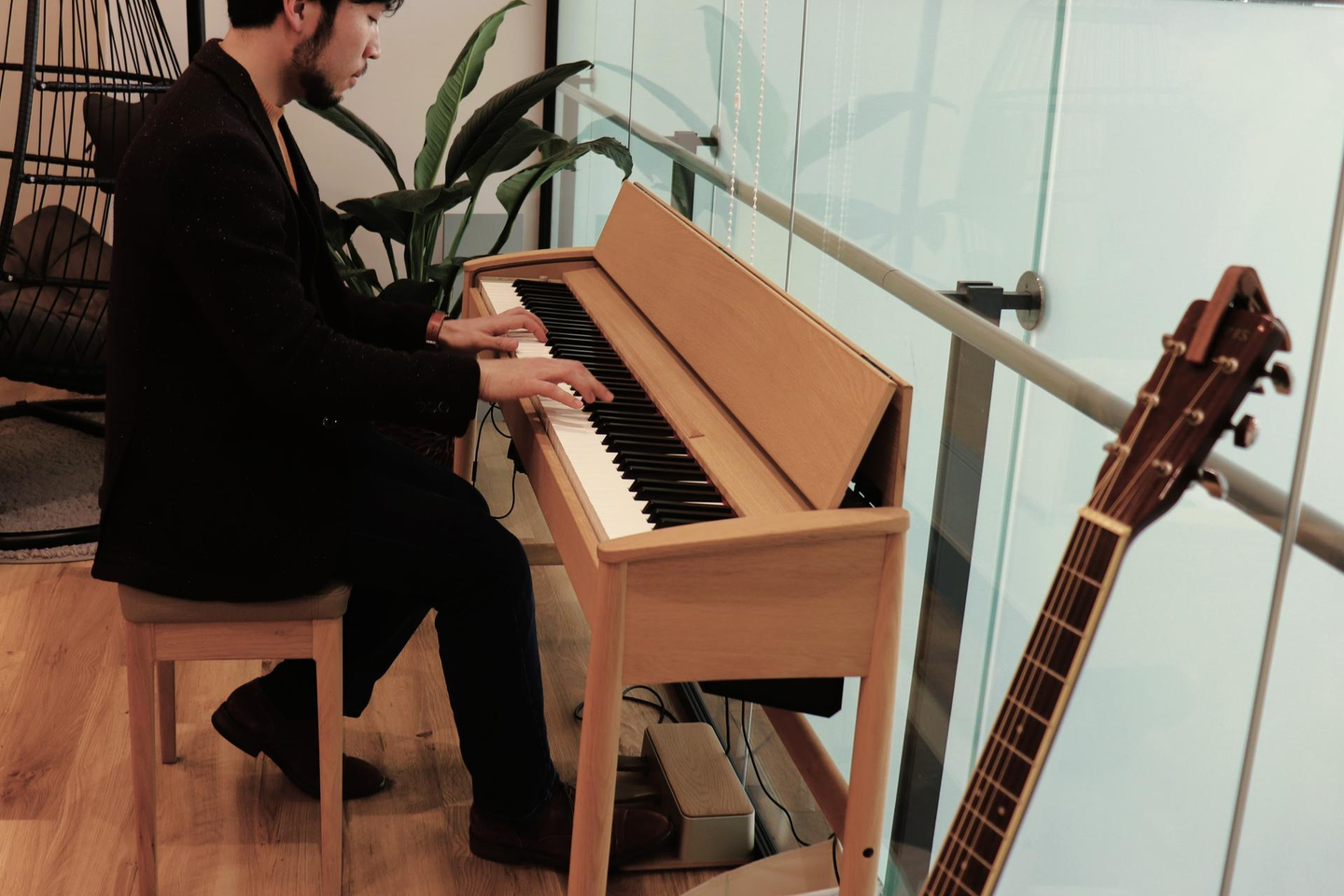 ビリヤード台の奥には……お気付きでしょうか。ピアノやアコースティックギターがございます。