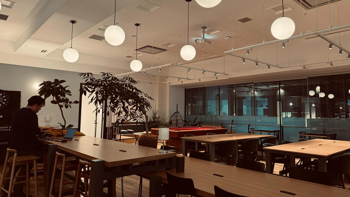 日中の、自然光がたっぷり降り注ぐ爽やかさとは打って変わり、照明が切り替わることでなんともムーディーな、別の側面を魅せてくれます。(定時後もデスクワークしたいときは、日中と同じ環境の執務スペースで作業しましょう)