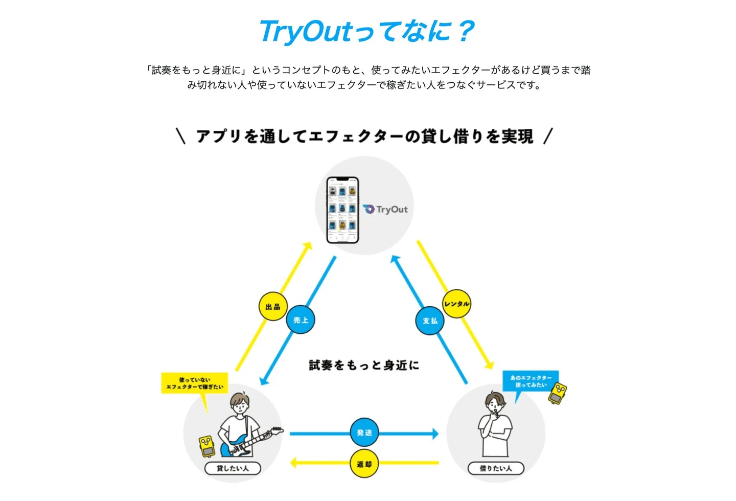 ”TryOut”とはエフェクターやアンプなどの音楽機材や楽器を“借りて、試してから買える”サービスです。