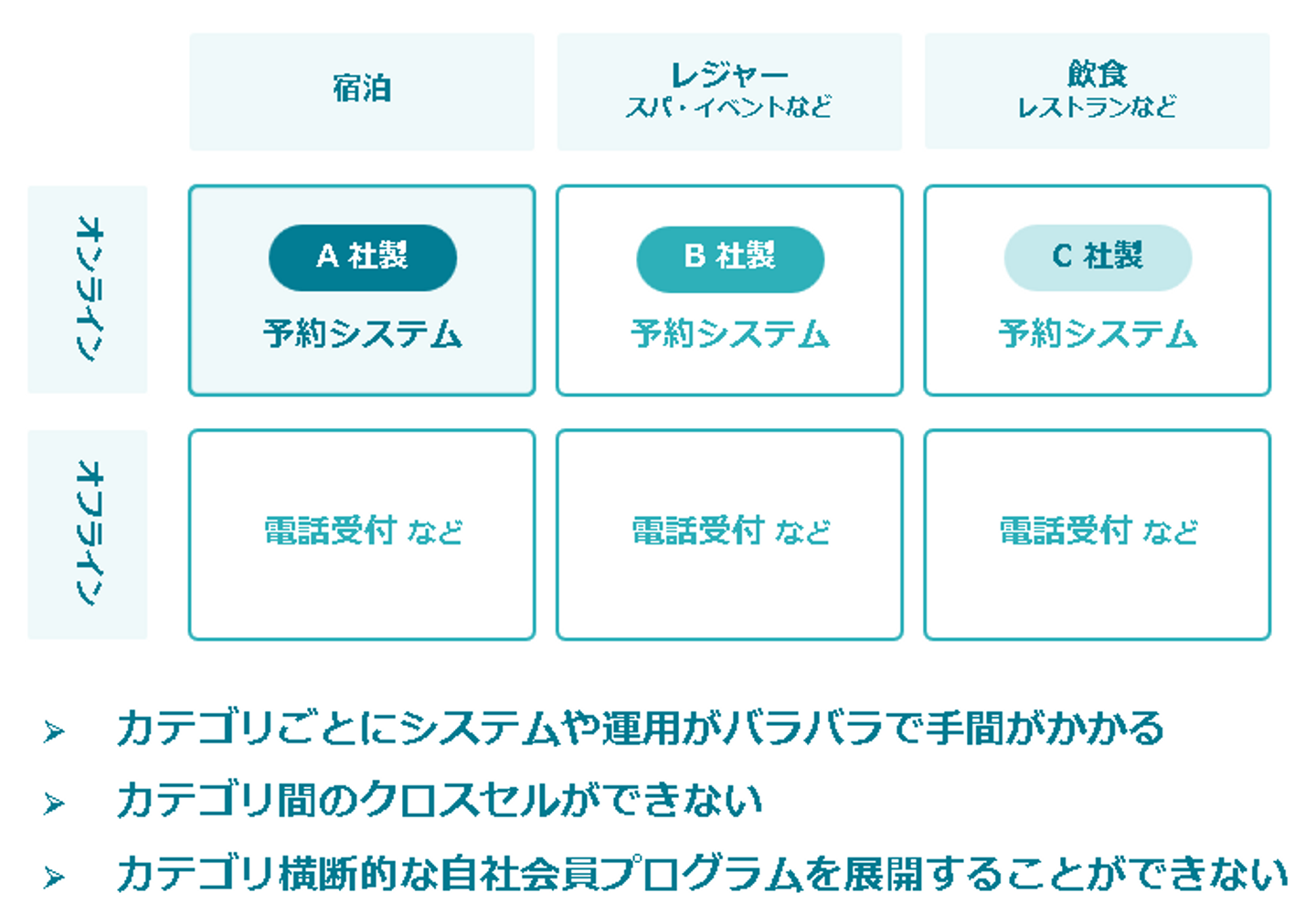 ※現状の直販予約では、カテゴリ毎にシステムや運用がバラバラになっており、手間がかかる状況かつカテゴリを横断した自社会員プログラムを展開することが難しい状態。(以下画像参照)