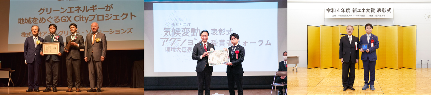 自然を傷つけずに太陽光発電施設を拡充し、さらに再エネの有効活用していくために独自のプラットフォームを開発し統合管理できる環境に。エネルギーのビッグデータを活用し「余剰電力循環モデル」を構築し、再生可能エネルギーを巡らせる事業を展開しています。こうした取り組みを評価され次のような賞を受賞しました。
