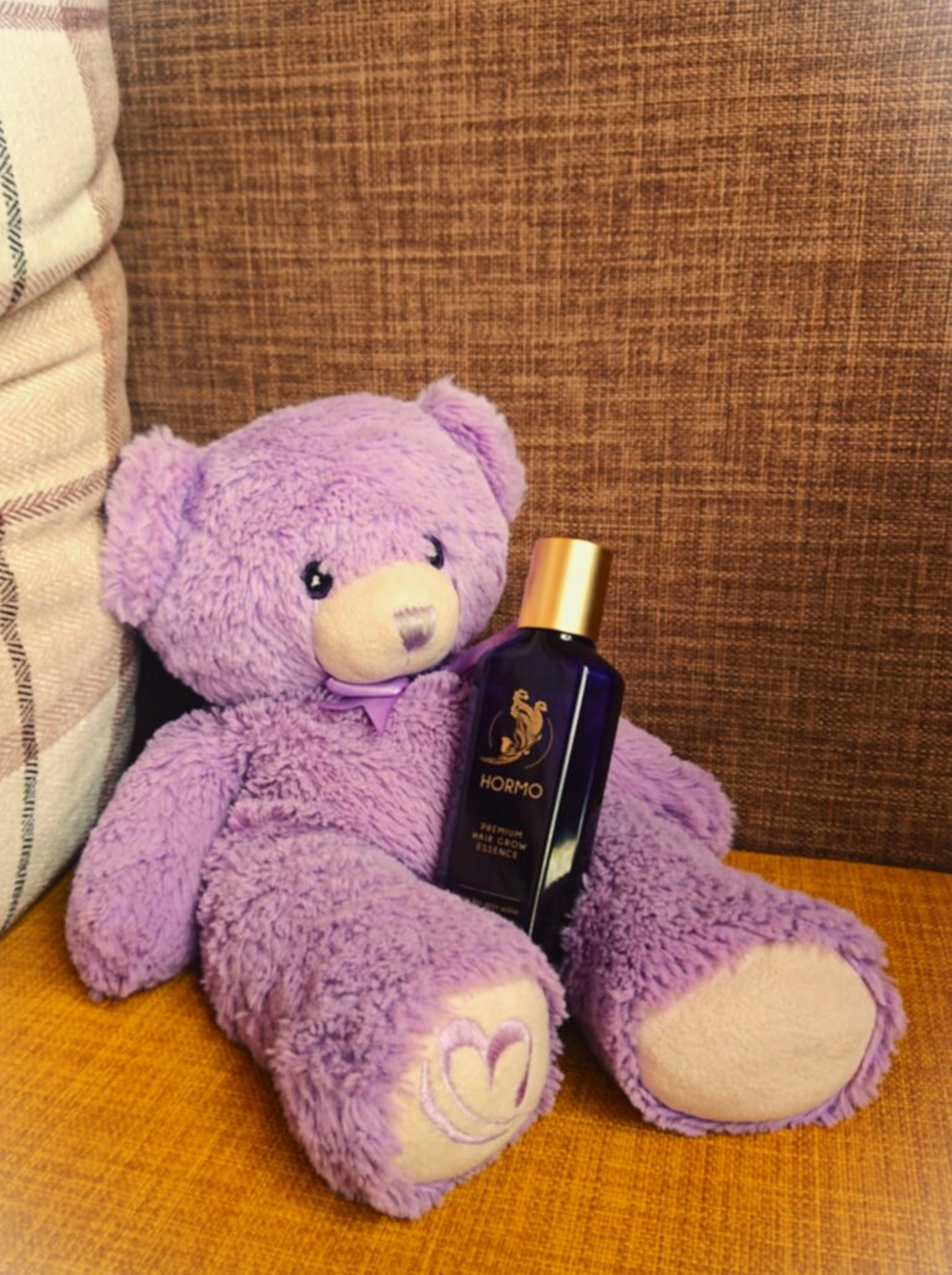 「今日もちゃんとHORMO使った?」眠りにつく前に、紫テディベアが話しかけてきます。パッケージの色味とマッチしているのがミソです。