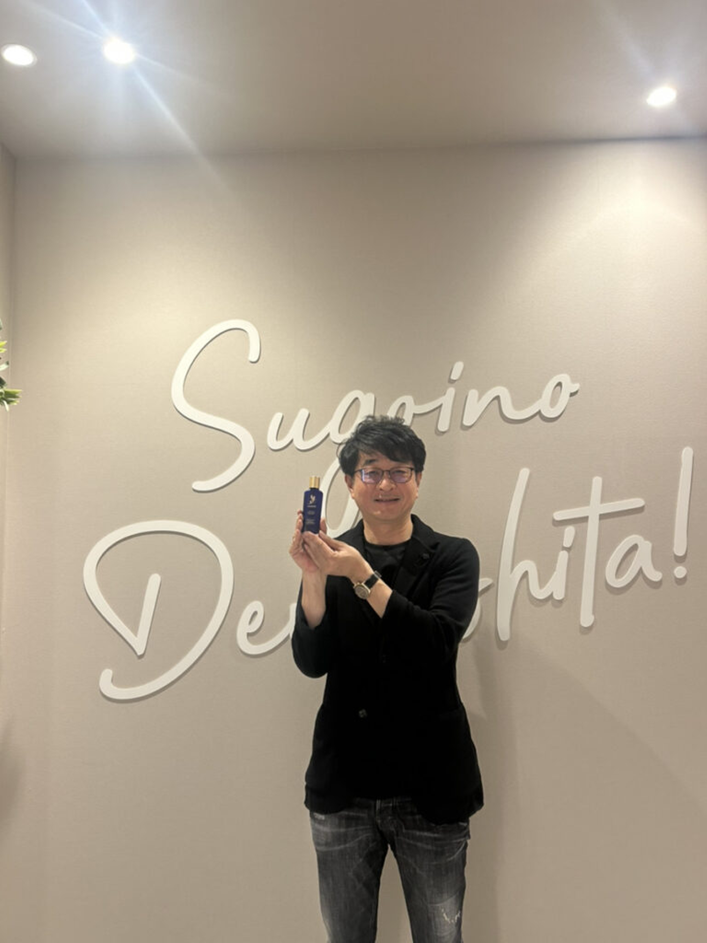 ついにハーブ健康本舗の代表・永松がモデルとして参戦!「SUGOINO DEMASHITA(すごいの でました)」を背景に商品をアピール。