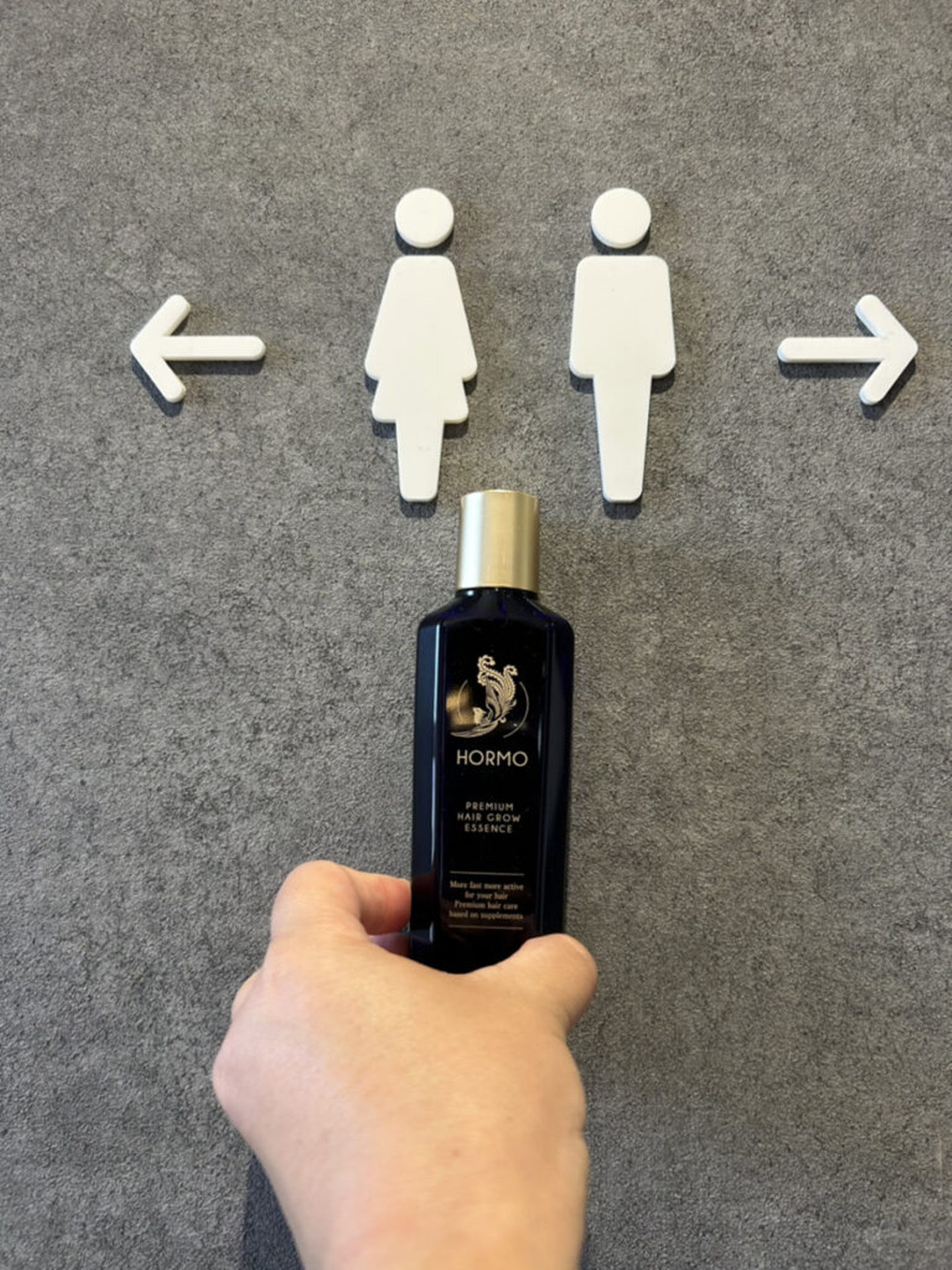 HORMOが男性にも女性にもおすすめな商品であることを、社内トイレのピクトグラムで表現しました。グレージュの背景でおしゃれさもプラス。