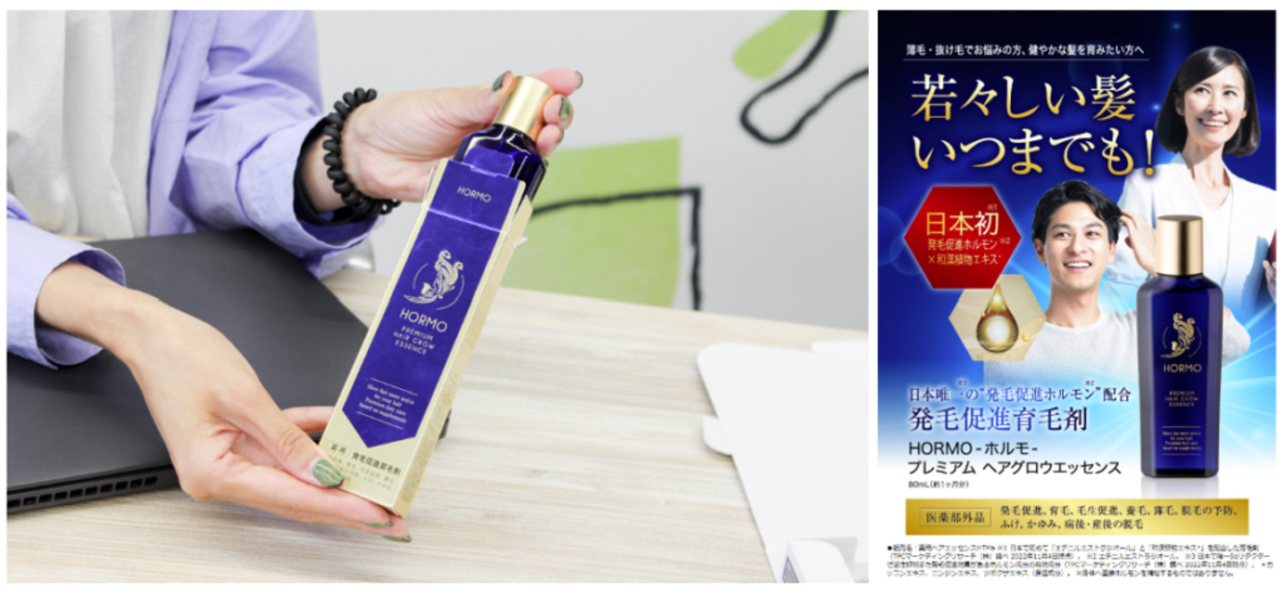 ●販売名:薬用ヘアエッセンスHTMa ※1 エチニルエストラジオール。※2 日本で初めて「エチニルエストラジオール」と「和漢植物エキス*」を配合した育毛剤(TPCマーケティングリサーチ(株)調べ 2022年11月4日時点)。 *カッコンエキス、ニンジンエキス、ツボクサエキス(保湿成分)。※身体へ直接ホルモンを補給するものではありません。