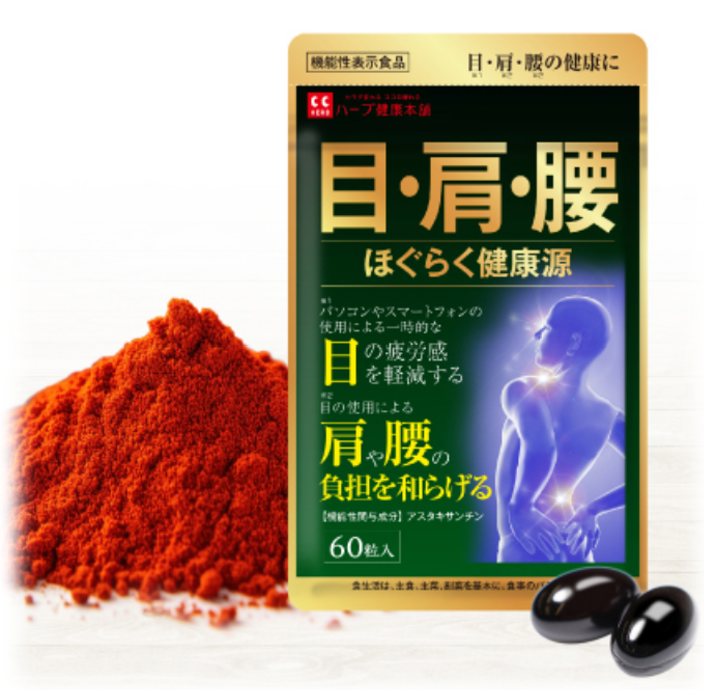 そんな時こそ『ほぐらく健康源』ですよ。おふたりが気になっている目はもちろん、機能性関与成分であるアスタキサンチンの働きで、目の使用による肩や腰の負担を和らげる効果も期待できます。