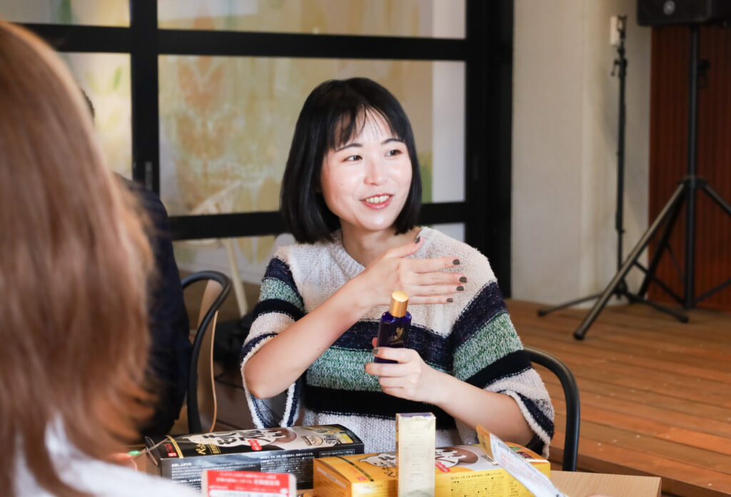 今日は、商品を愛用しているメンバーが揃っているんですよね。皆さんは普段、どの商品を使っていますか?私はいろいろな商品を使っていますが、中でも『ホルモ(HORMO)プレミアムヘアグロウエッセンス』は、使用感もよく気に入って使っています。