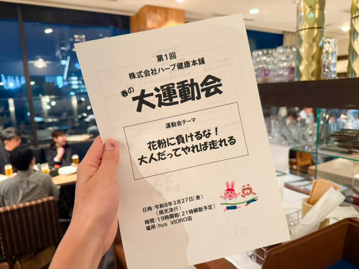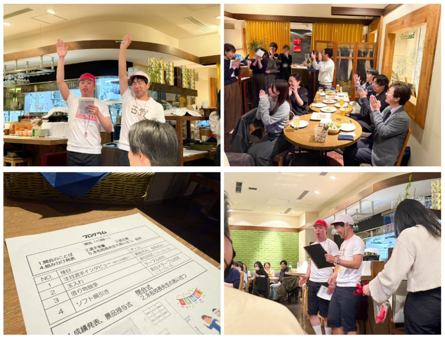今回は「花粉に負けるな!大人だってやれば走れる」のスローガンのもと、大人が本気で楽しめる運動会をコンセプトにした慰労親睦会。もちろん店内をダッシュで駆け回ることはせず、食事や飲み物を楽しみながら、童心に帰って盛り上がれる企画が目白押しでした。