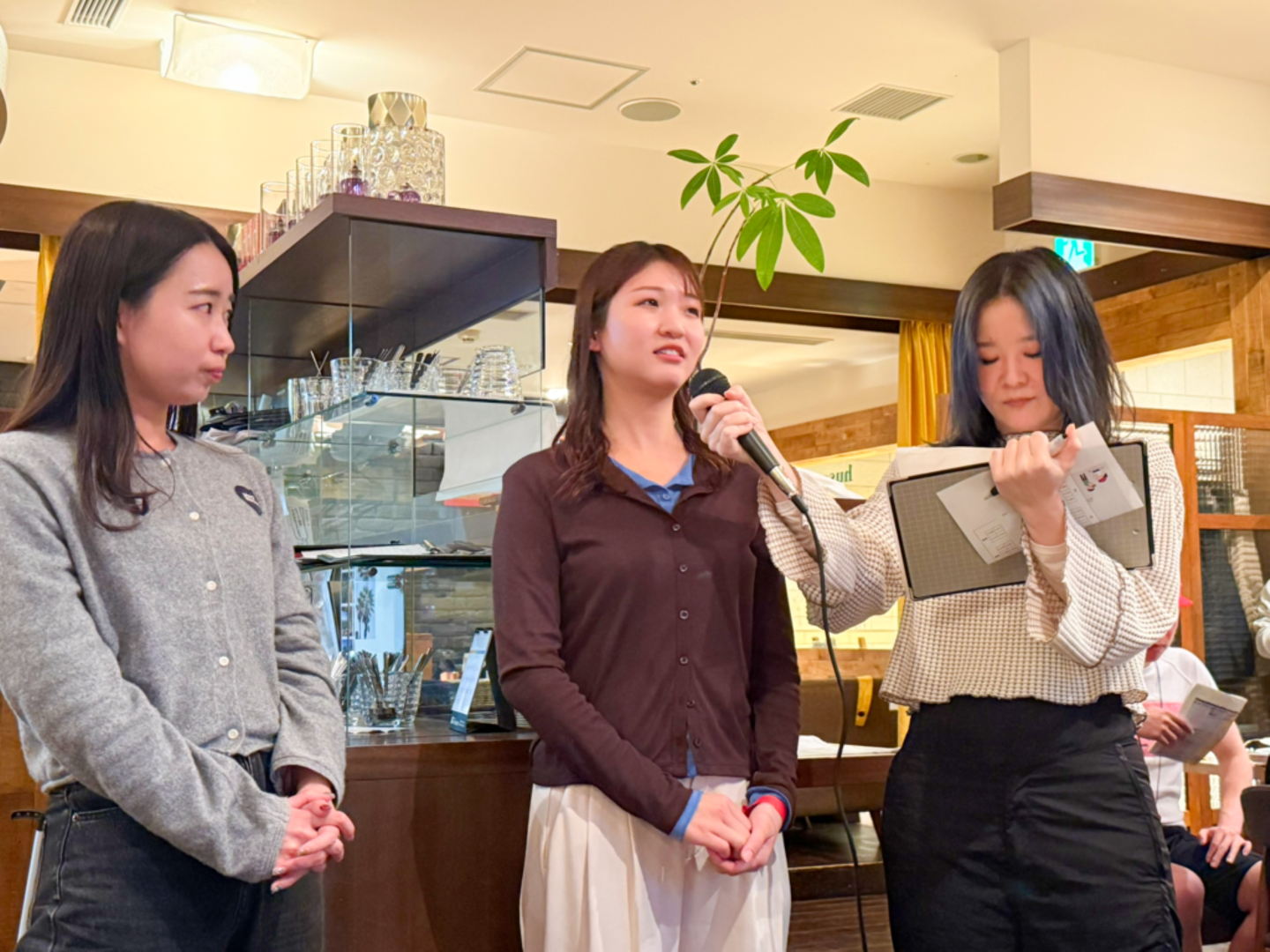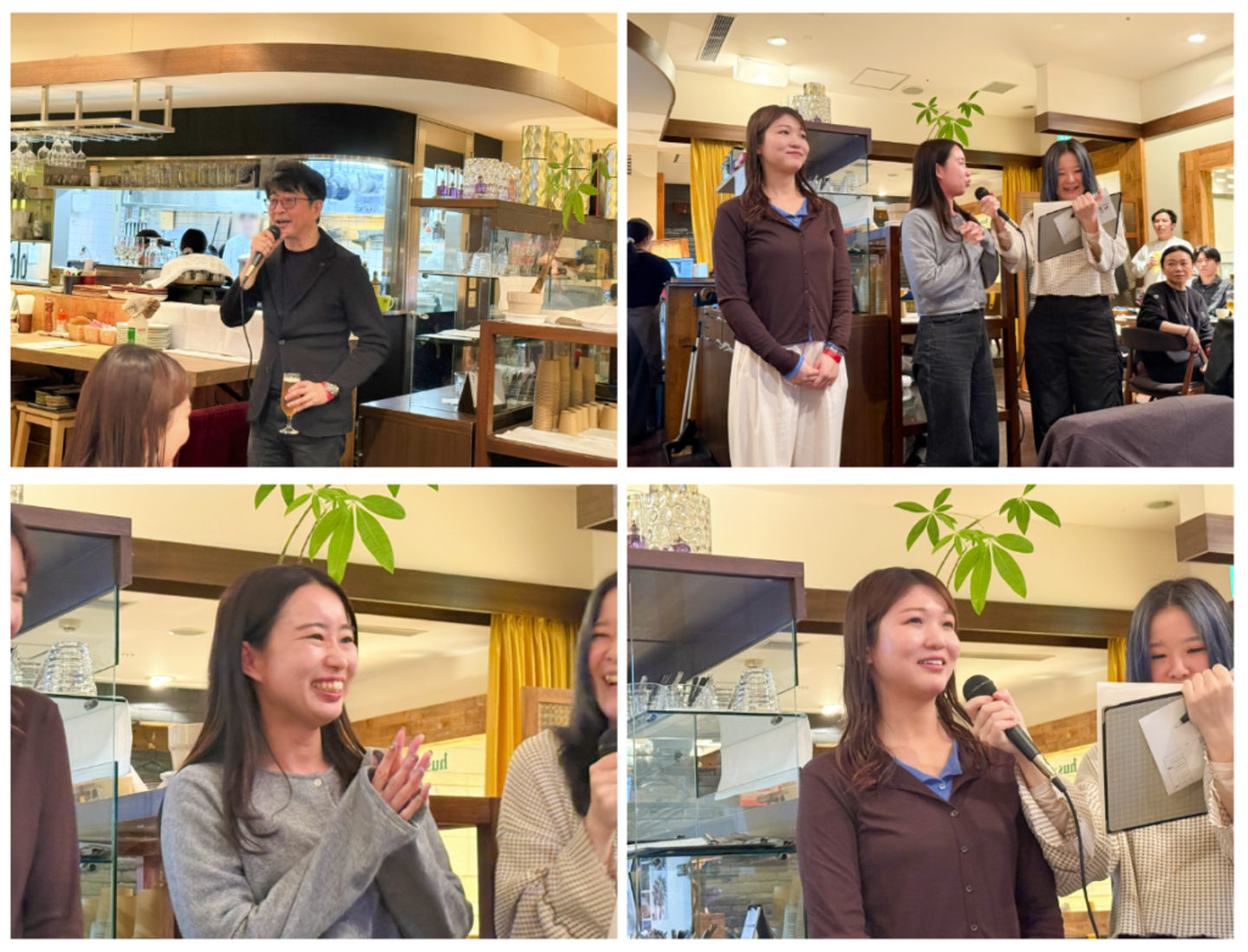校長先生(役)の代表・永松の音頭で乾杯した後は、注目選手インタビューと称して、直近入社したメンバーの自己紹介タイムが設けられました。出会いの季節でもある春、仲間が増えるのはとても嬉しいことです。