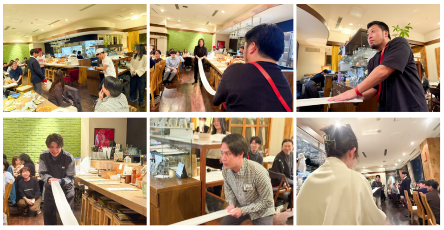 大トリは、双方がトイレットペーパーの先端をもって引っ張り合う「ソフト綱引き」。破れたトイレットペーパーの長い部分をもっていた方の勝利です。各テーブルの代表者1名が選出され、敢えて力強く引っ張ったり、逆に相手に引っ張らせたり…各人の戦略が光る名勝負が繰り広げられました。