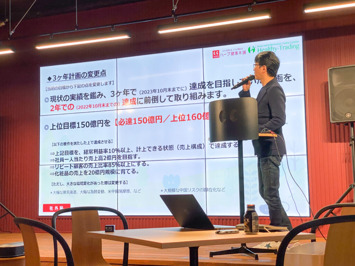 そういった背景から、経営企画のメンバーや各部署の責任者と再度打ち合わせをしたところ、各部署の責任者が皆「無謀ではない目標ですよ!」と言っていたので、それならば…と思い、3ヶ年計画を1年前倒しする決断をしました。ハーブは2022年度、つまり今年度中に年商150億円を必達目標、160億円を上位目標として掲げ、達成を目指します。