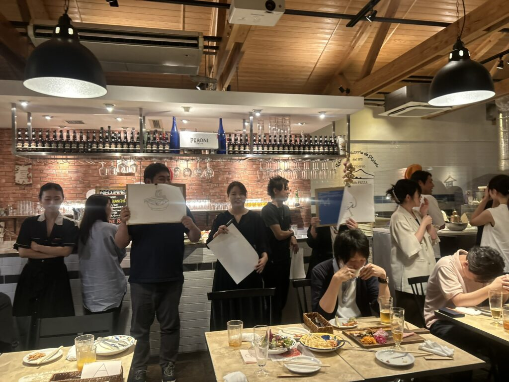 この日は広告メディア企画とカスタマーサービスの面々が幹事。ゆったりと食事を楽しみつつ、会の途中では絵だけでお題を伝える「お絵描き伝言ゲーム」を実施!