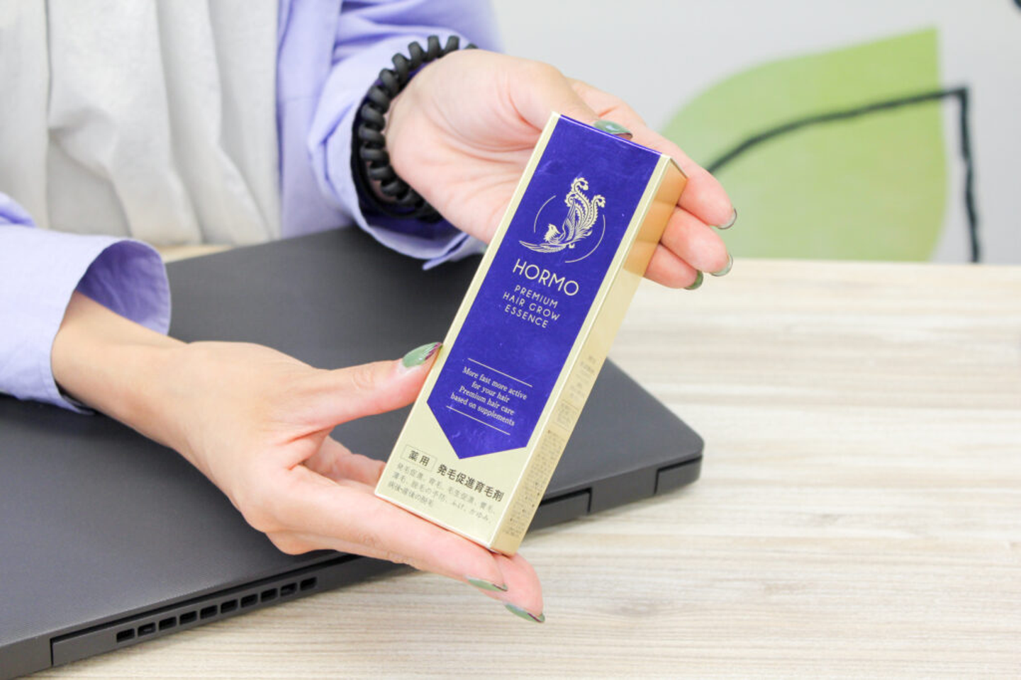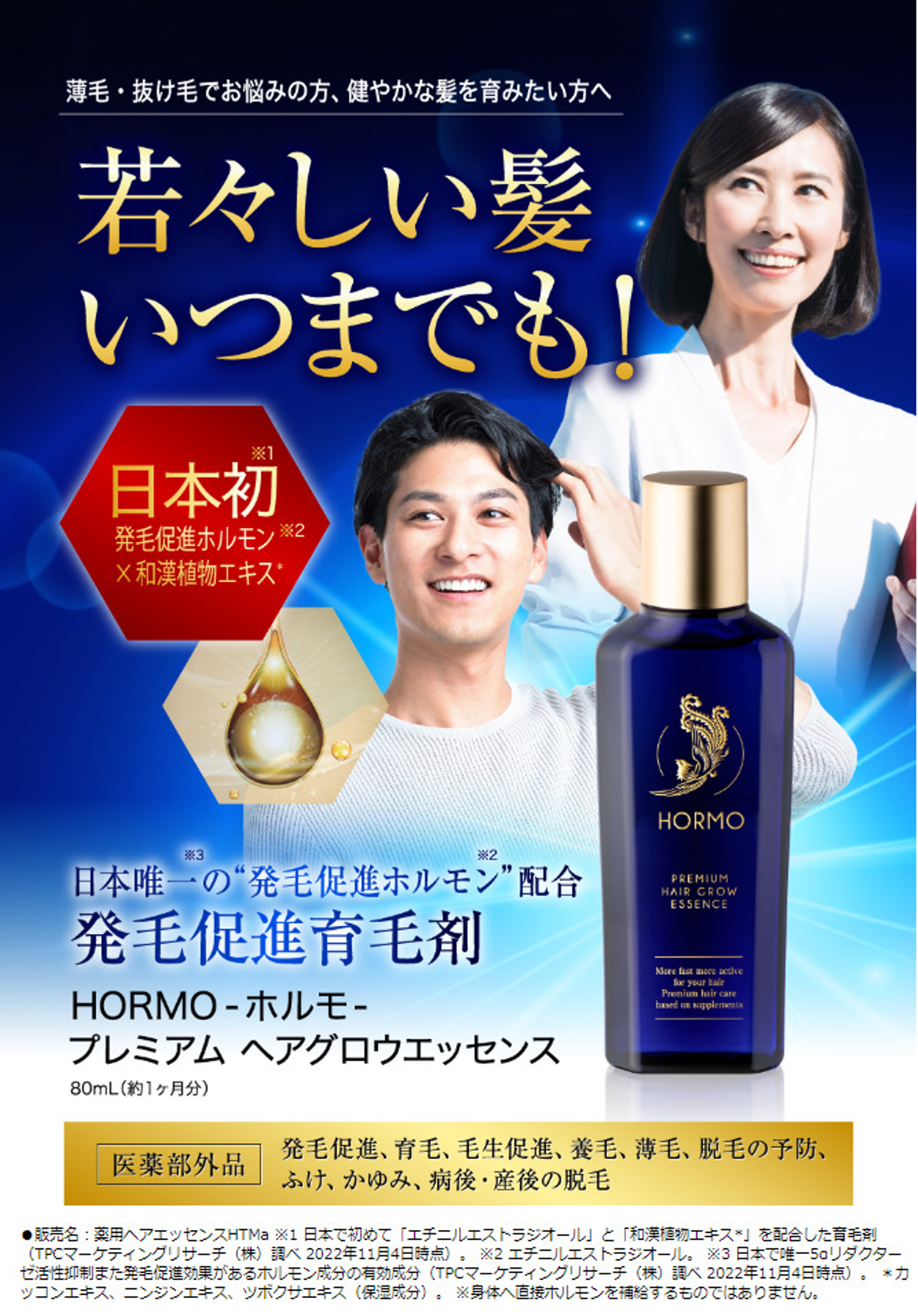 『HORMO -ホルモ- プレミアムヘアグロウエッセンス』は、髪の成長を助ける発毛促進ホルモン(※1)と、厳選した和漢植物エキス(*)を配合した、日本初(※2)の発毛促進育毛剤です。