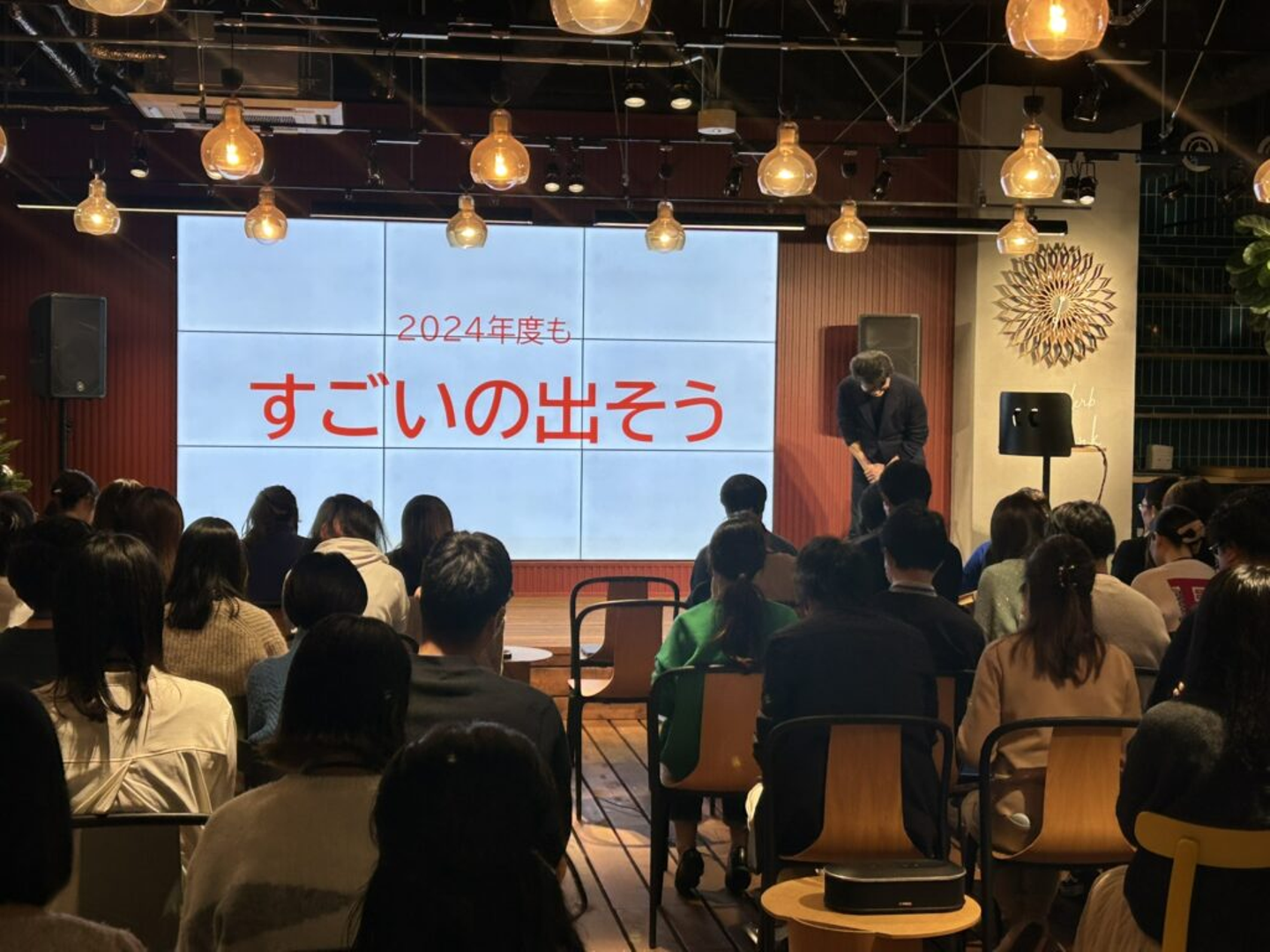 2023年度の結果とその要因を全員で理解し、2024年度にやるべきことを明確にして、新しい目標と今後会社が向かう方向性を確認するために、代表の永松をはじめ各事業部のリーダーから説明がありました。