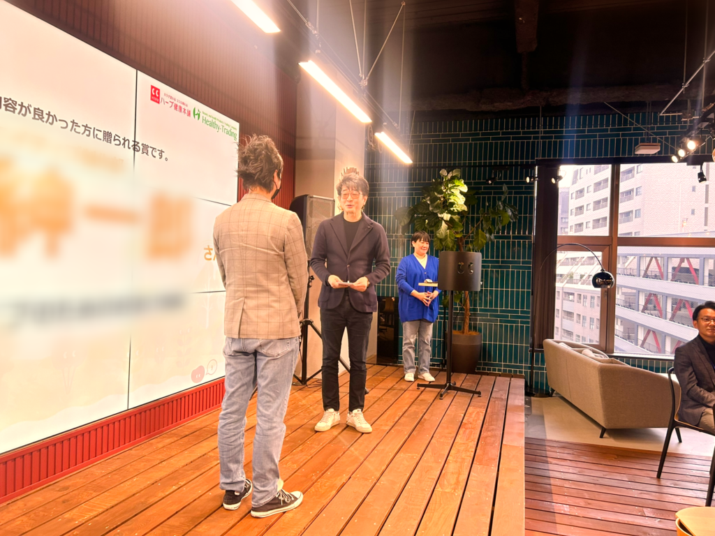 たくさんの提案を出してくれたメンバー。内容が秀逸で、会社の成果に大きく結びつくアイデアを提案してくれたメンバー。半期の間に登場したアイデアマン3名に、副賞として商品券を贈呈しました。