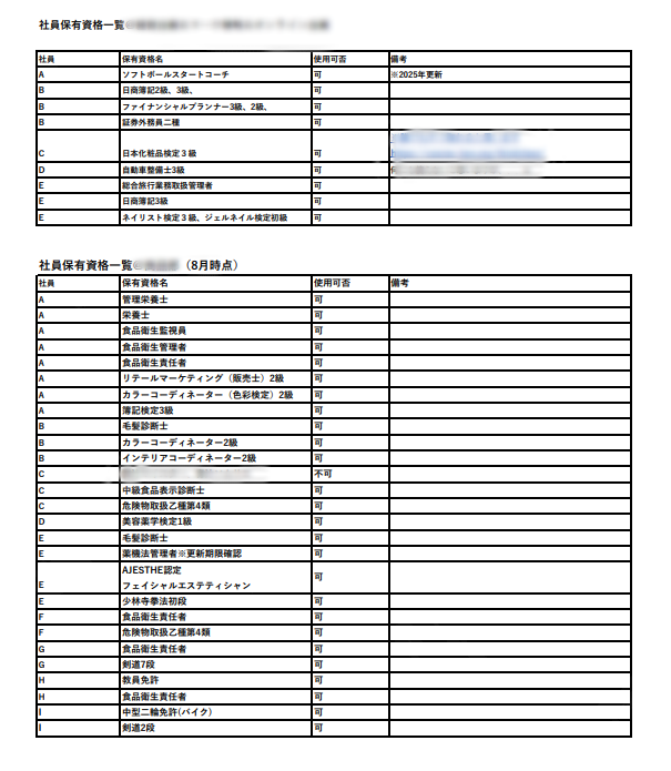 提案から間もなく、資格所有のアンケートが実施され、取得一覧のリストが全メンバーに共有されました。