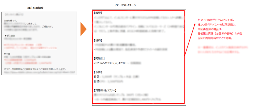 多々周知・連絡される販促の情報を、誰がみても読み取れるよう整理しよう!という観点で、形式なく自由に周知していた現状を改善し、誰が見ても施策の内容を大まかに把握できる、固定フォーマットを用意するアイデアが提案されました。