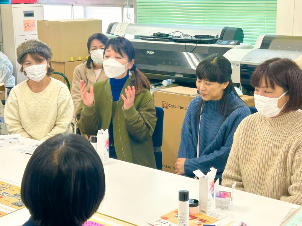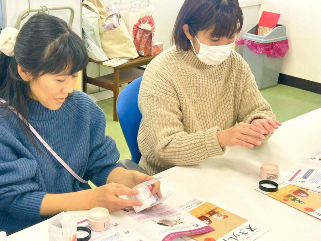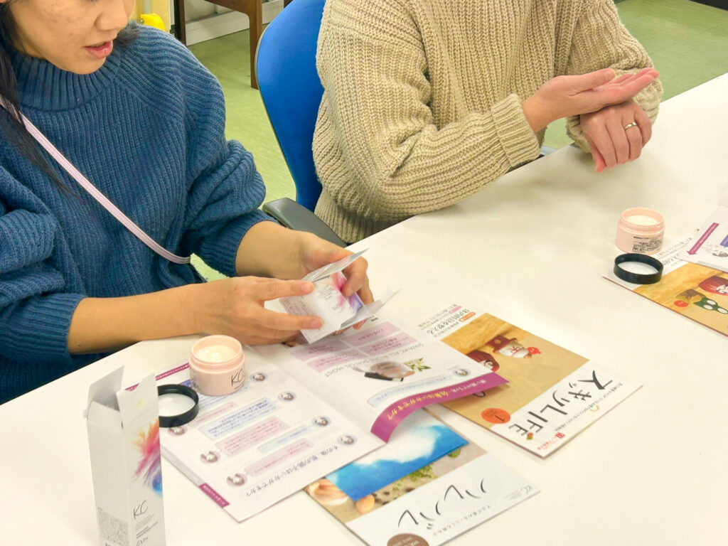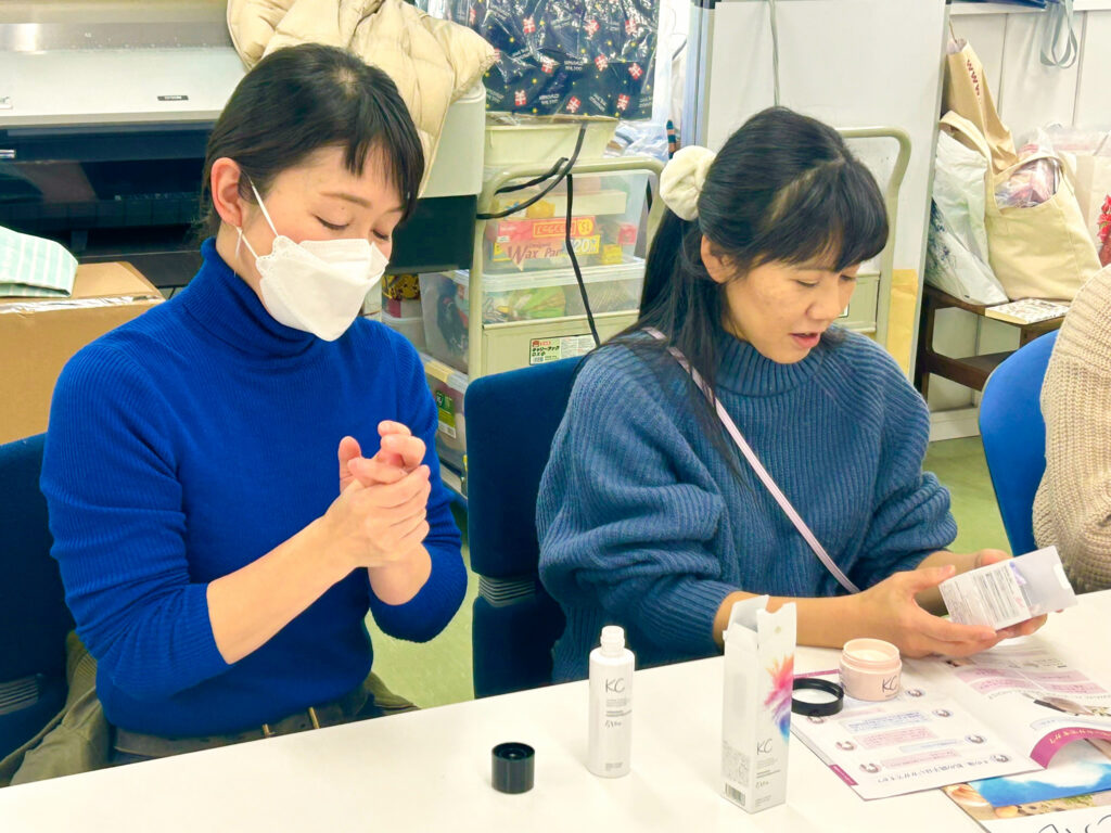 その場でオールインワンジェルを手にとり、使ってくださる「すまいる」の皆さま。「ベタつかないですね!」と使用感に対するお褒めの言葉をいただきました。