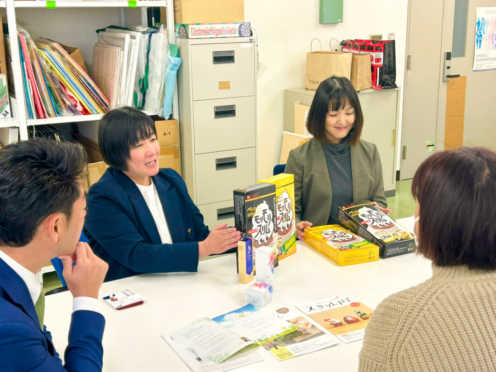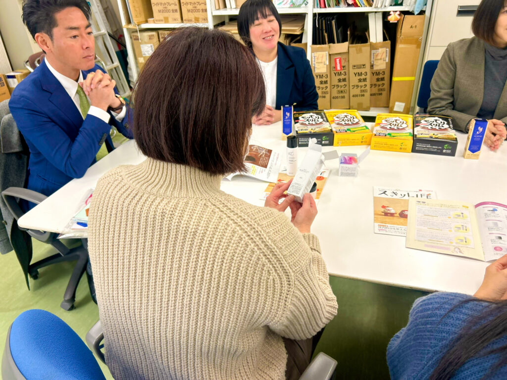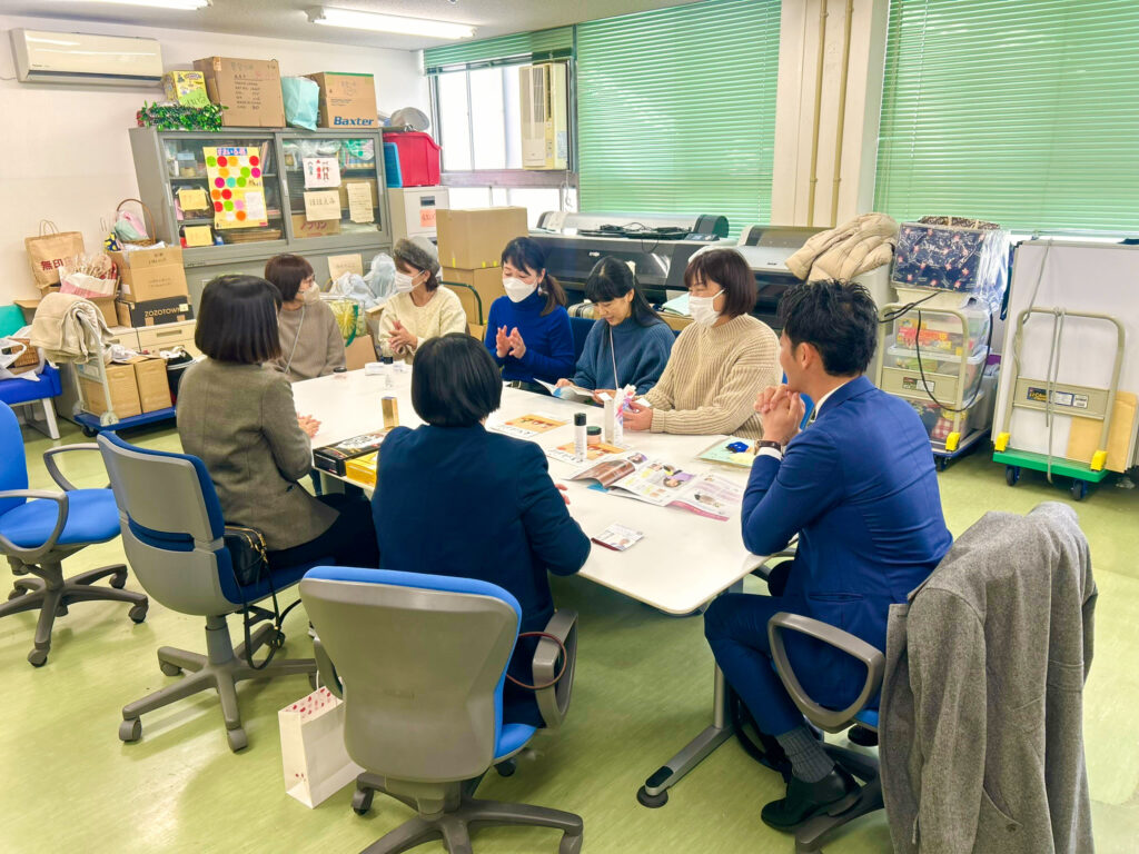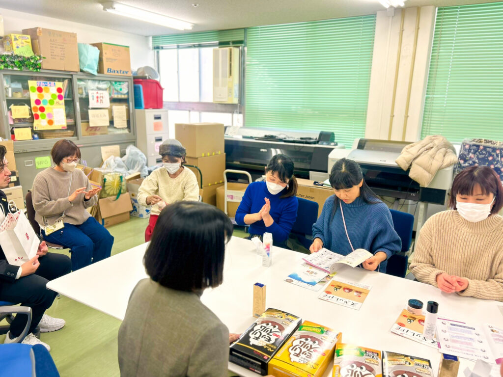 当日は、会社を代表して、商品開発・武下とカスタマーサービス・羽野が面談に参加。「すまいる」の皆さまから、活動への想いをお伺いしつつ、商品を寄贈させていただきました。