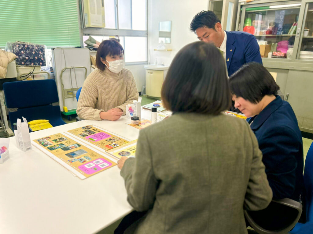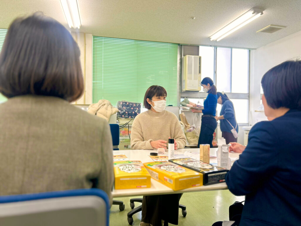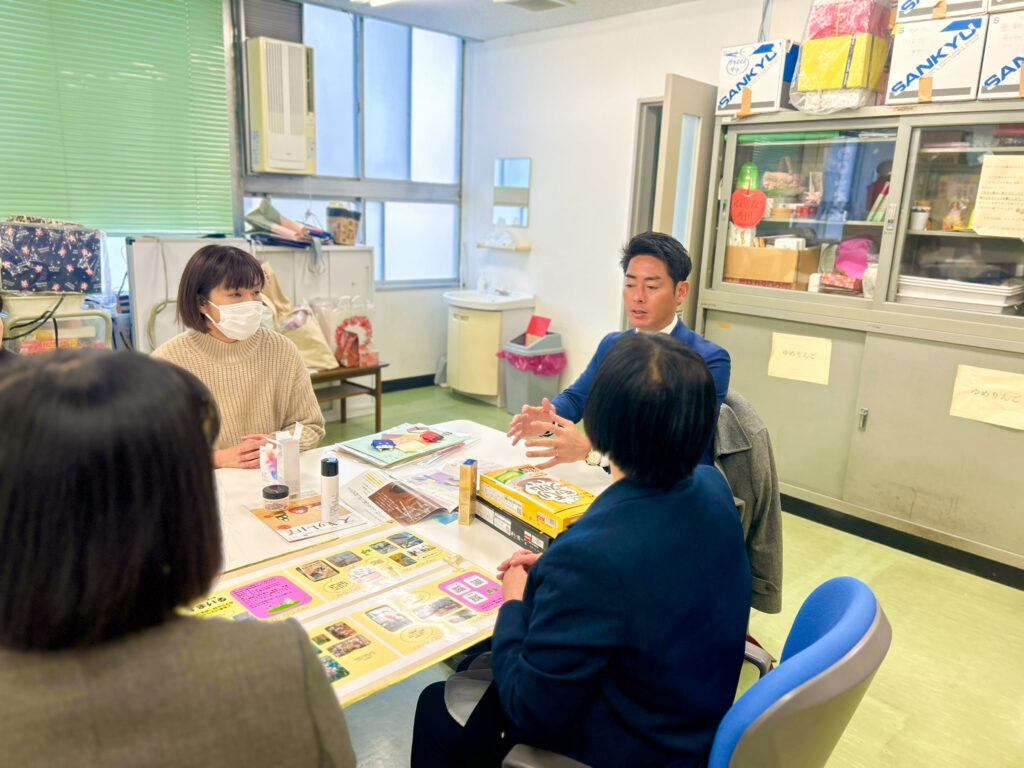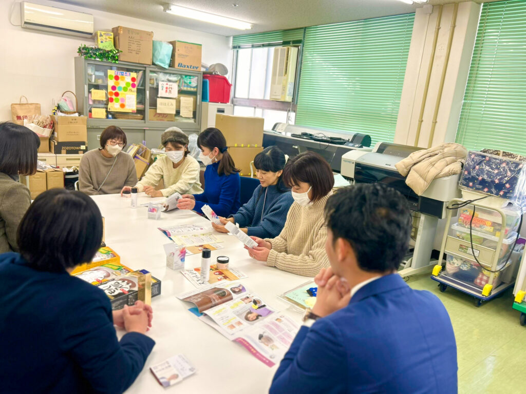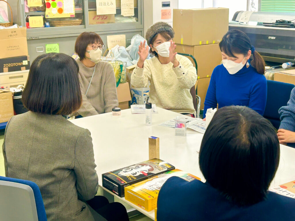 当日は、会社を代表して、商品開発・武下とカスタマーサービス・羽野が面談に参加。「すまいる」の皆さまから、活動への想いをお伺いしつつ、商品を寄贈させていただきました。